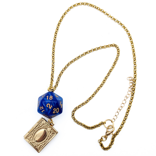 Wizard D20 Character Class Dice Necklace with Spellbook Charm - Blue D&D Dice Pendant