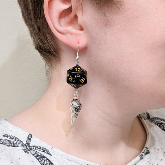 D20 Raven Queen Character Earrings - DND Dice Earrings with Bird Skull Charm