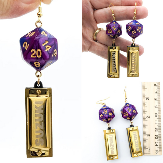 D20 Bard Character Earrings with Functional Miniature Harmonicas