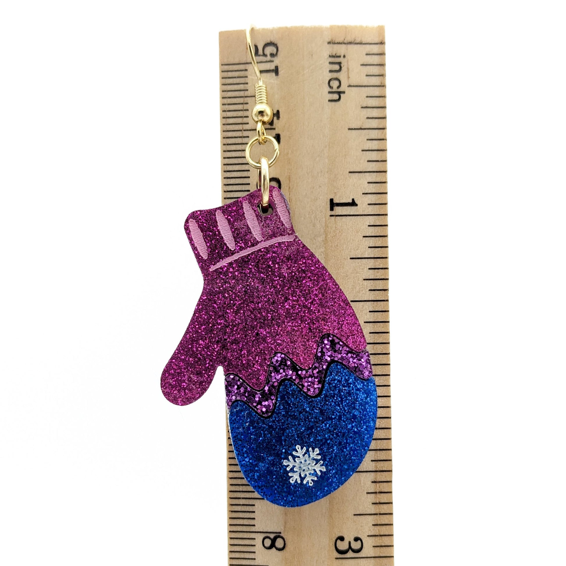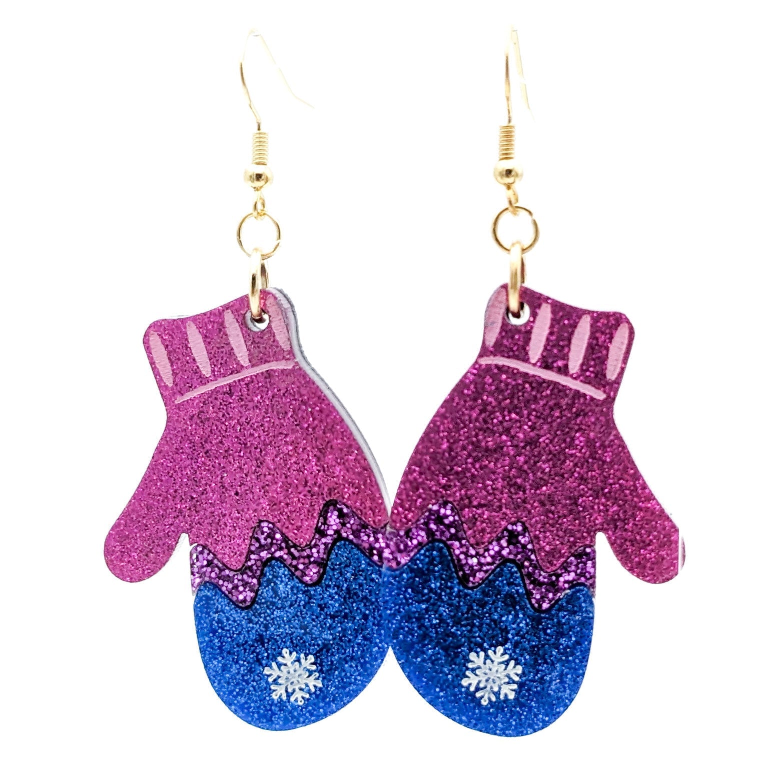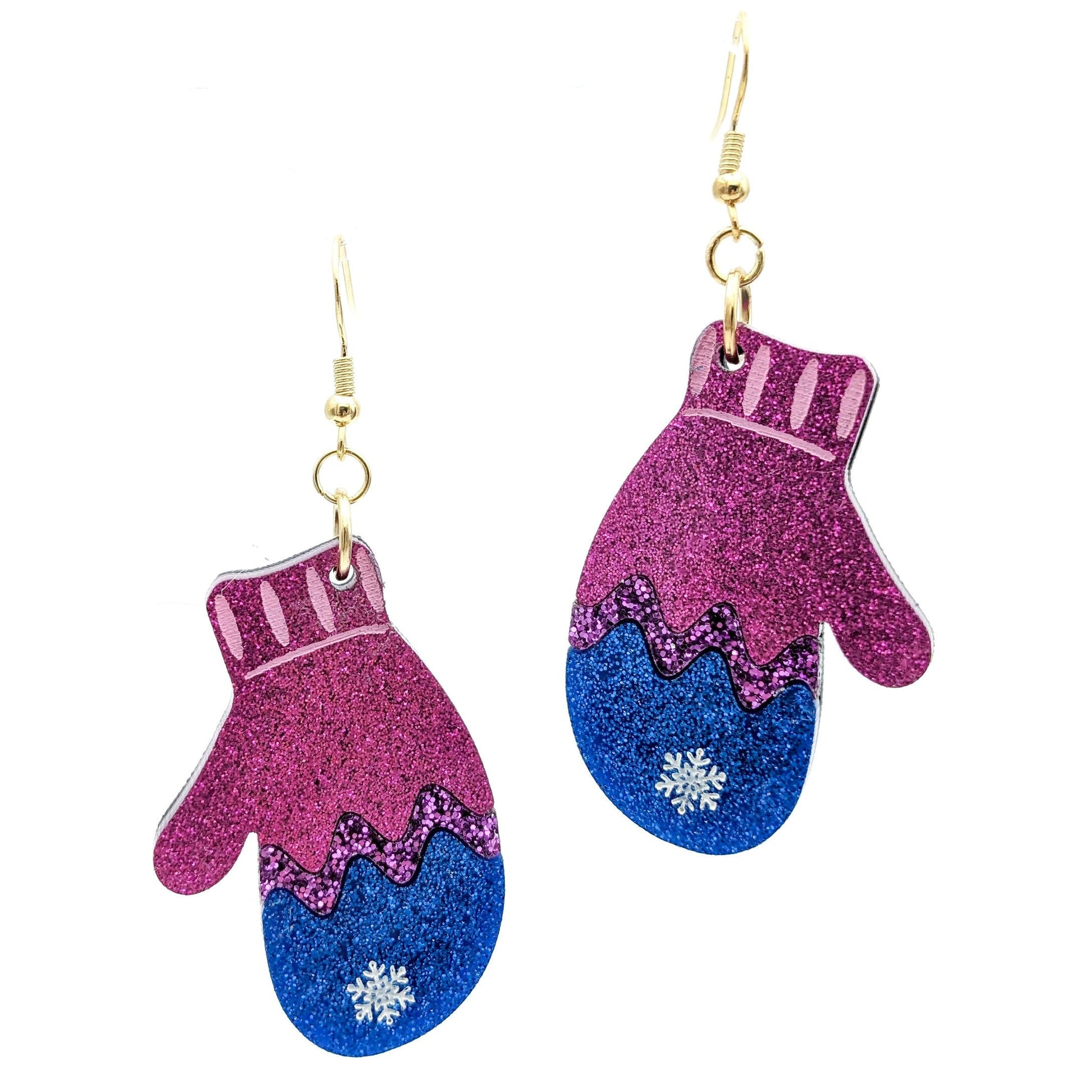 Pink and blue mittens with a sparkly purple stripe and a cute snowflake accent are a subtle and unique way to signal bi pride every day. These are made of laser-cut acrylic in glitter colors that mirror the bisexual pride flag. They have a black back and come with gold-plated earring hooks. (If you want silver hooks instead, message me!)