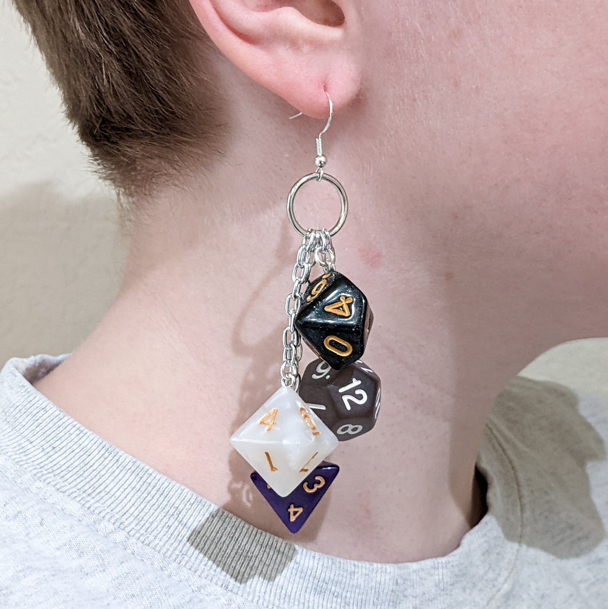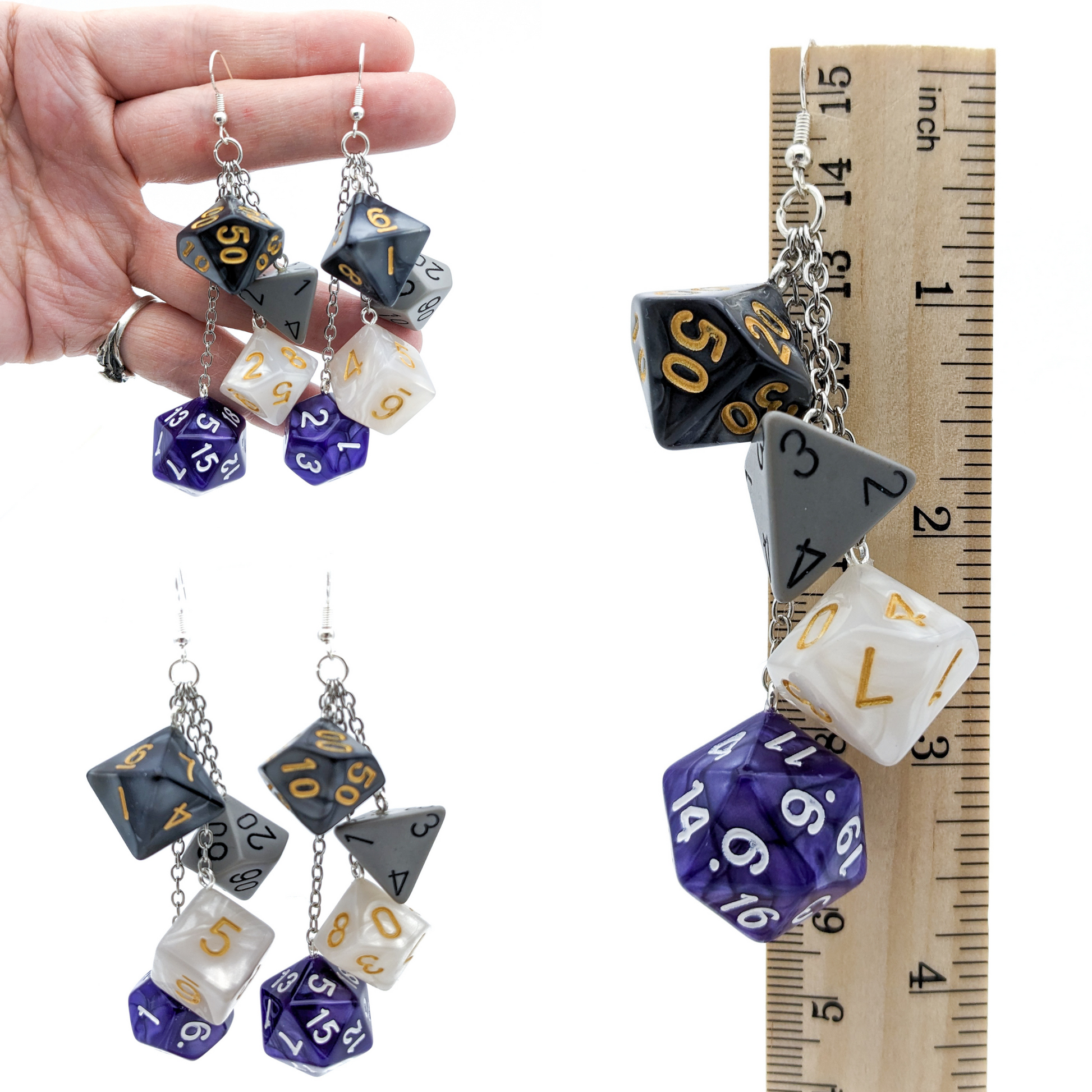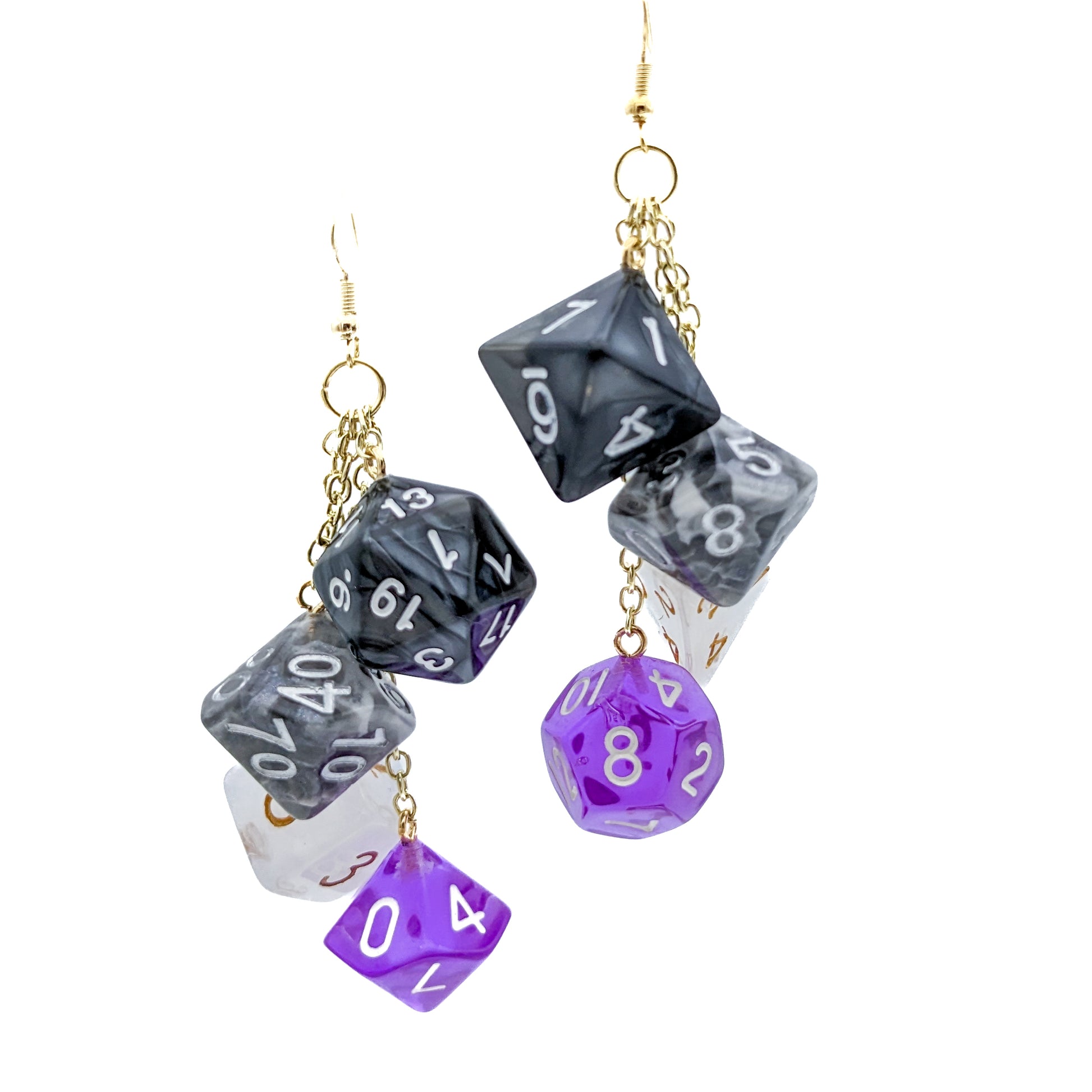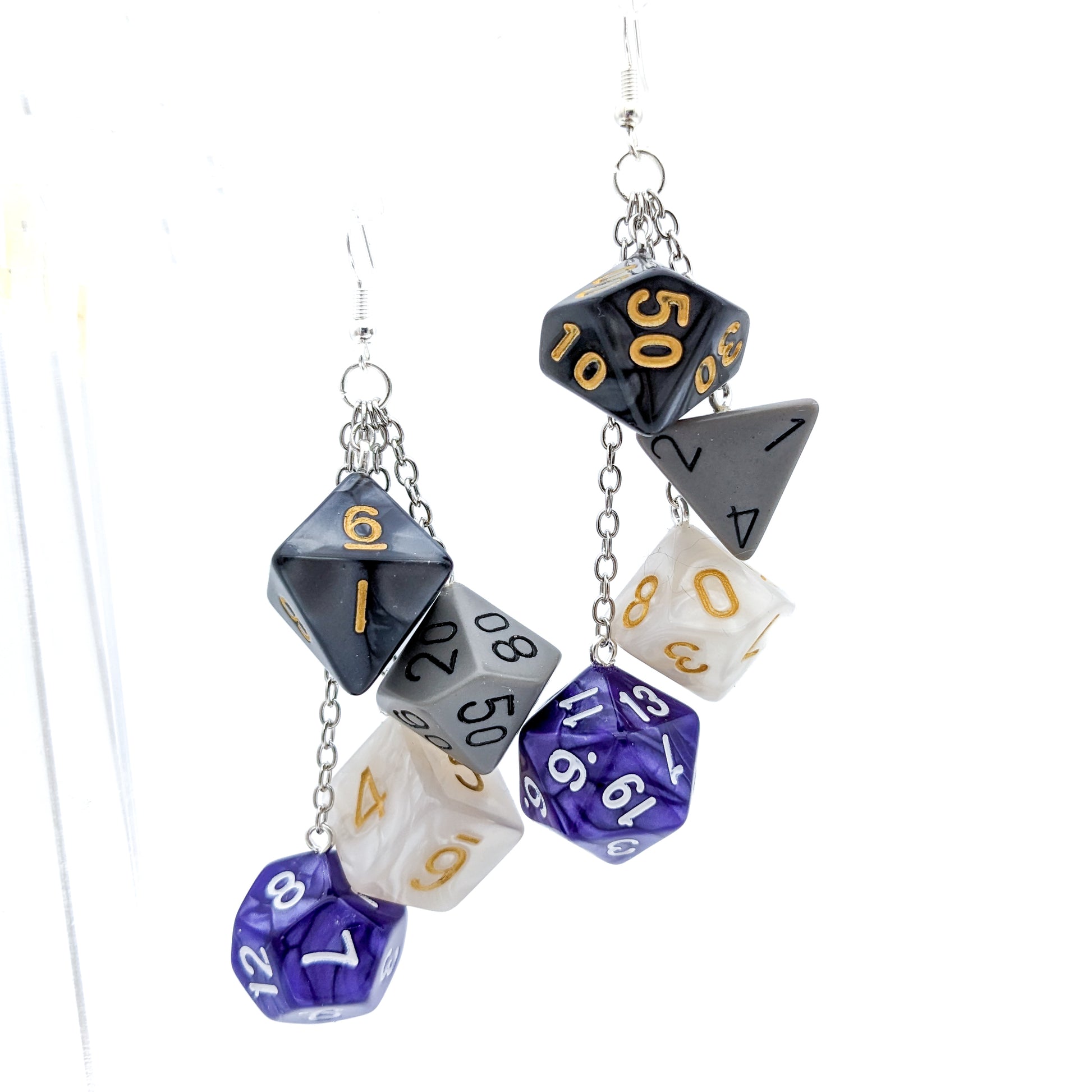 This RPG-inspired earrings feature polyhedral dice that mirror the colors of the asexual pride flag: black, gray, white, and purple. Signal your pride and love of gaming with these geeky, quirky, fun earrings. Great for lovers of D&D, Pathfinder, or other tabletop RPG games.