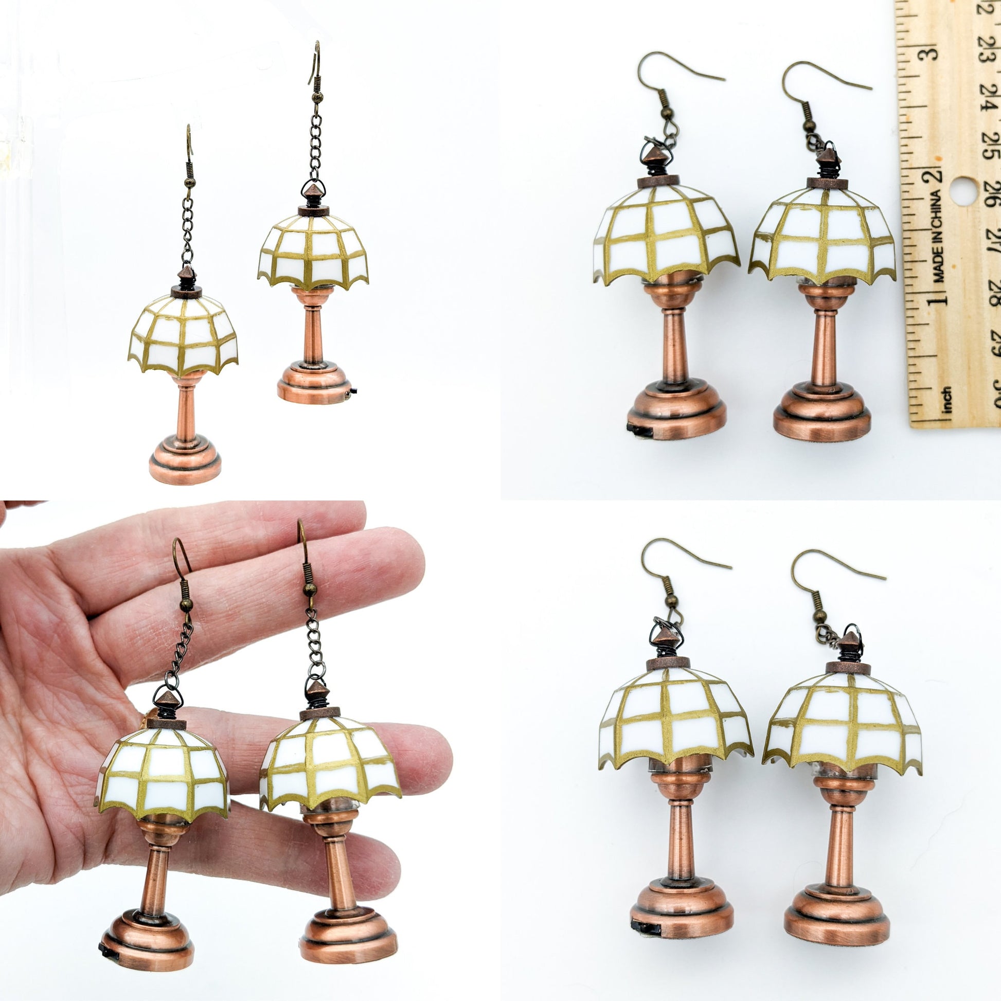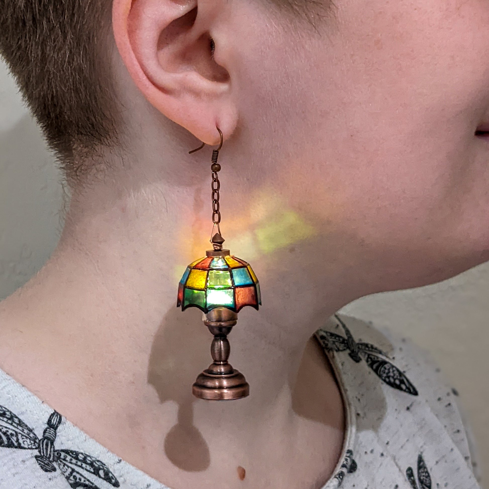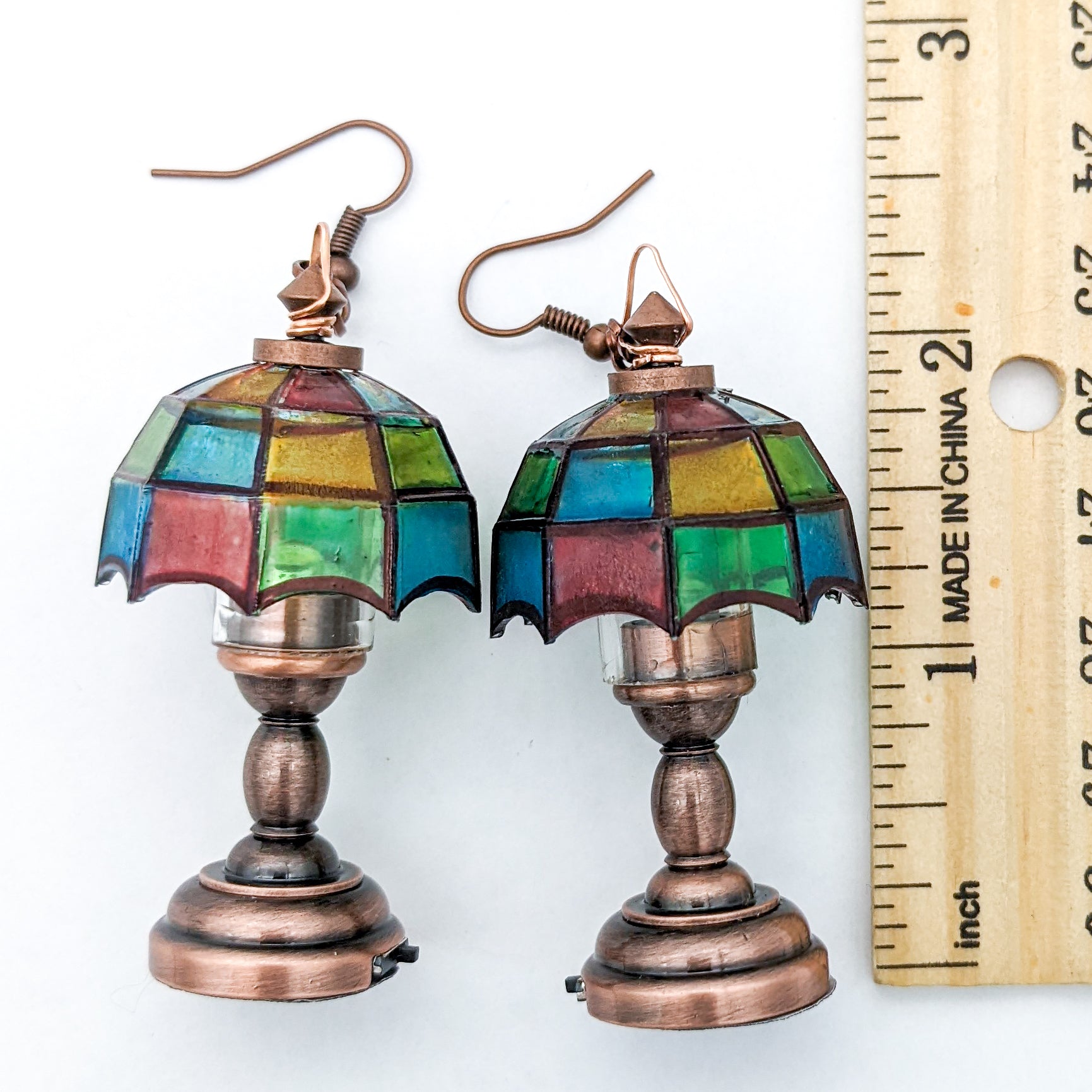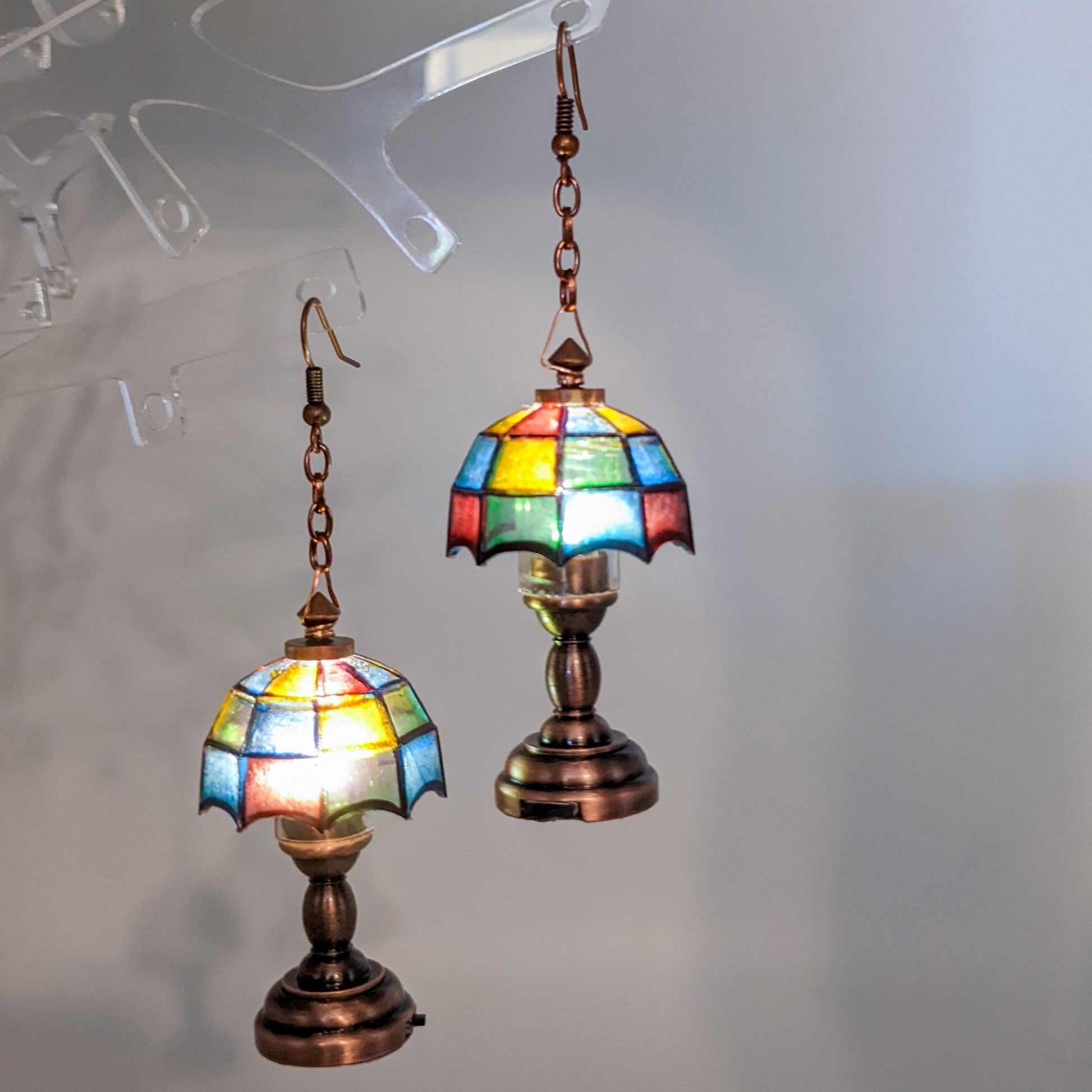 These 1:12 scale Tiffany-style table lamps make fabulous earrings that actually work! Each lamp is about two inches tall and has a copper base. The lampshade is multi-colored plastic that casts a wonderful glow across your neck and cheeks when you turn on the lamp. A small switch in the base switches the LED light on and off.