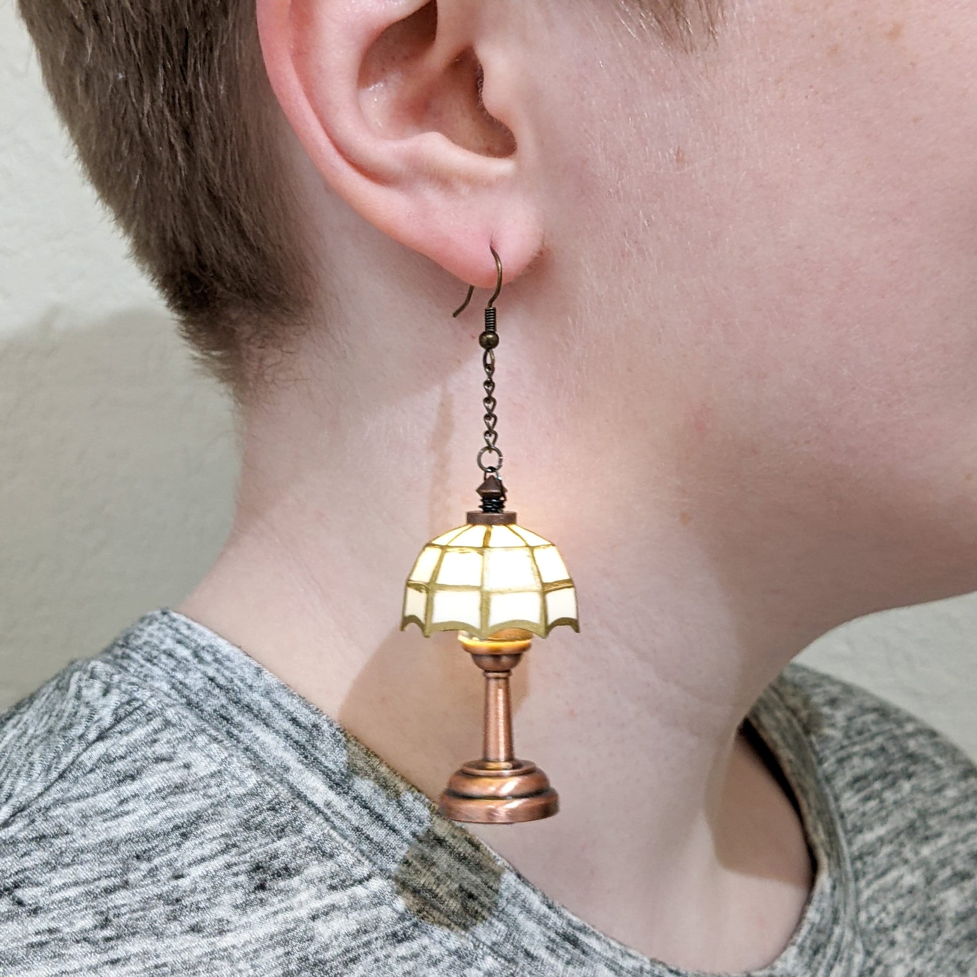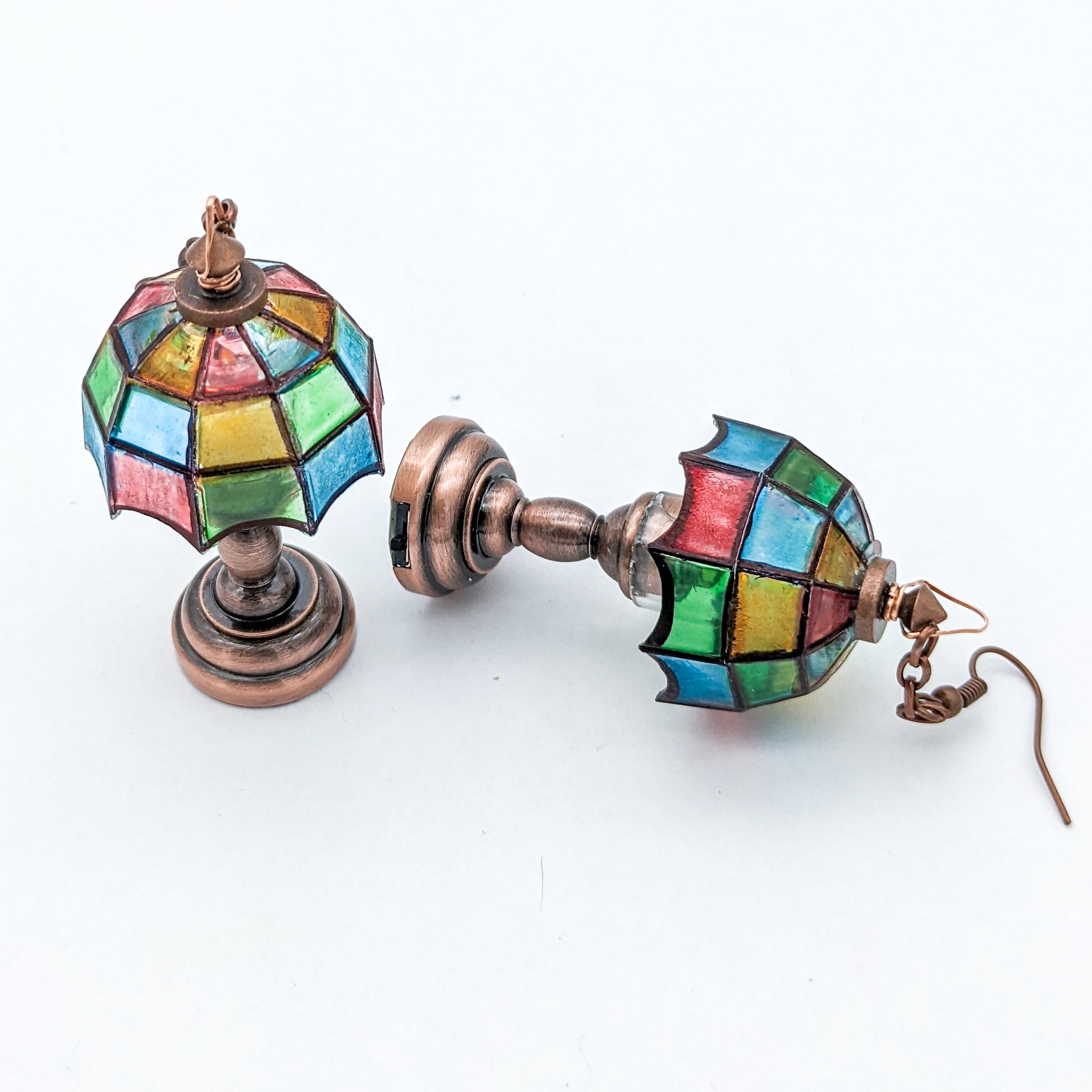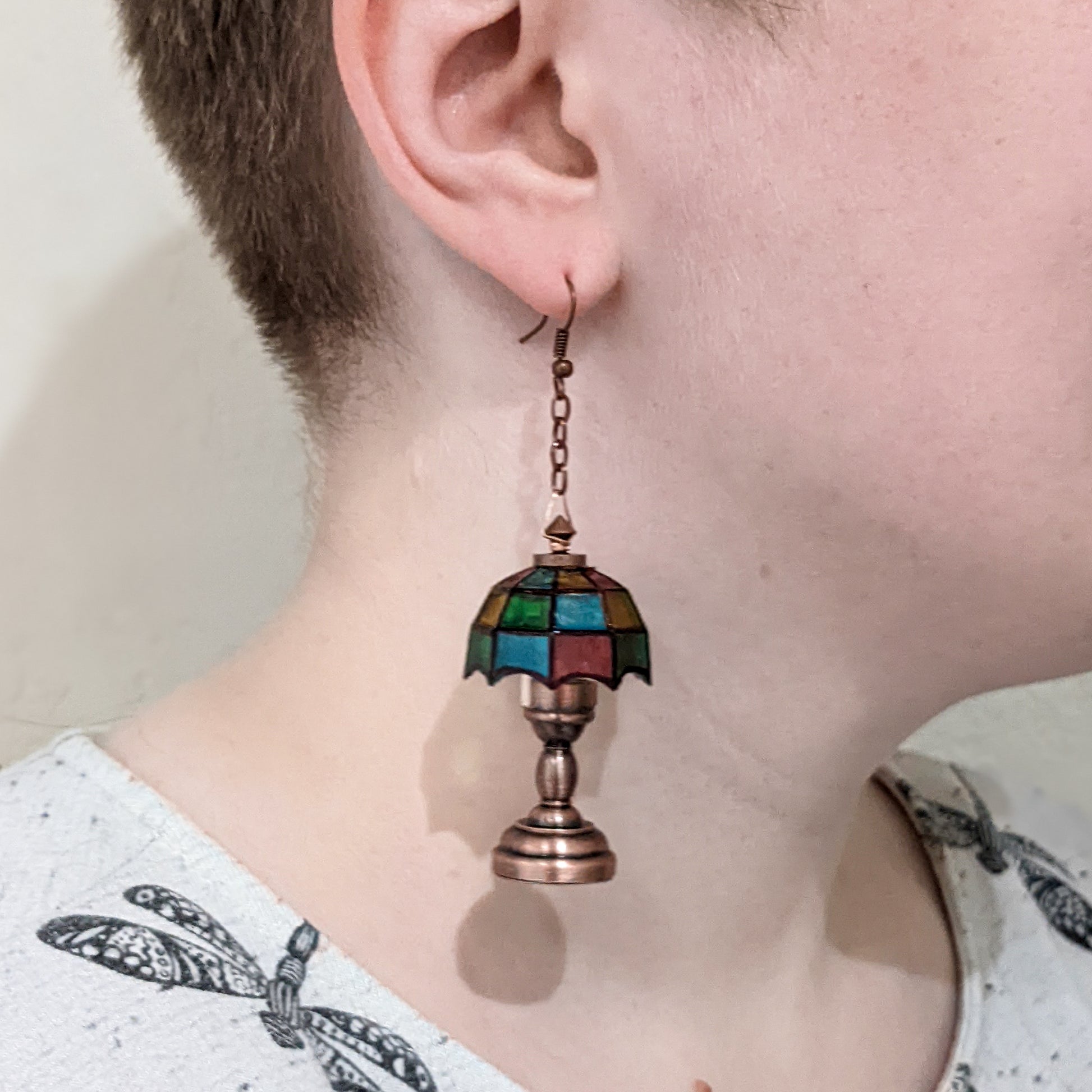 These 1:12 scale Tiffany-style table lamps make fabulous earrings that actually work! Each lamp is about two inches tall and has a copper base. The lampshade is multi-colored plastic that casts a wonderful glow across your neck and cheeks when you turn on the lamp. A small switch in the base switches the LED light on and off.
