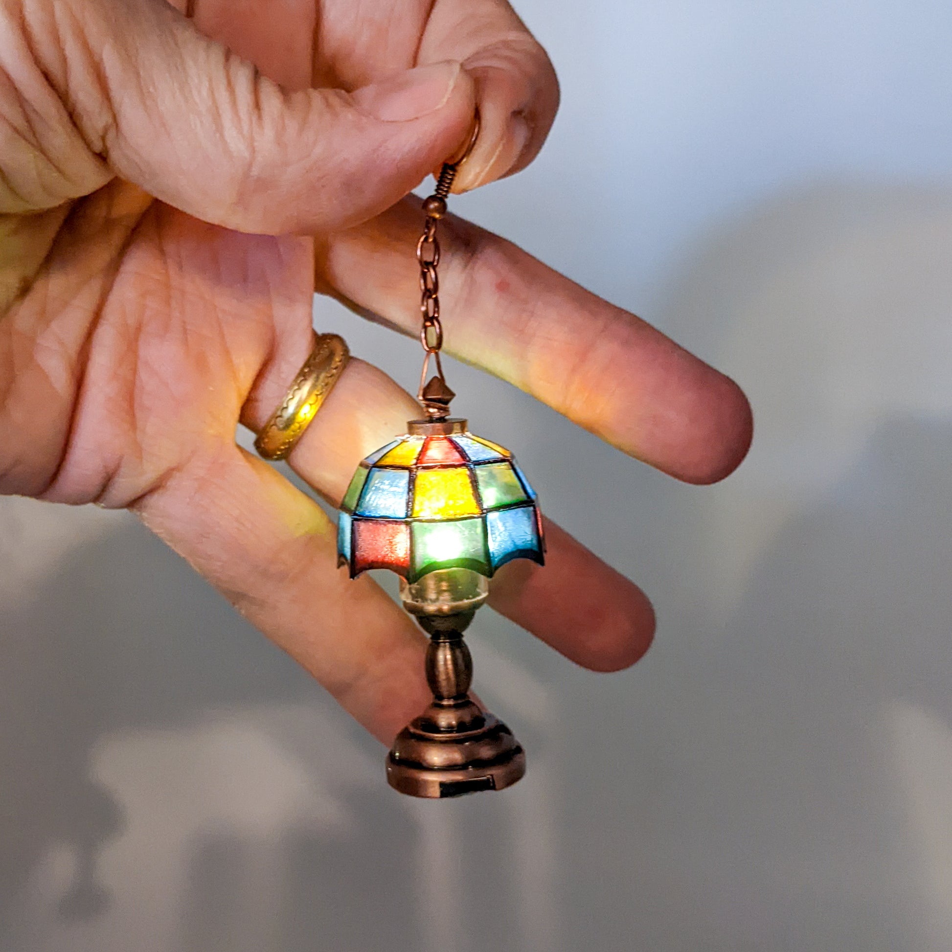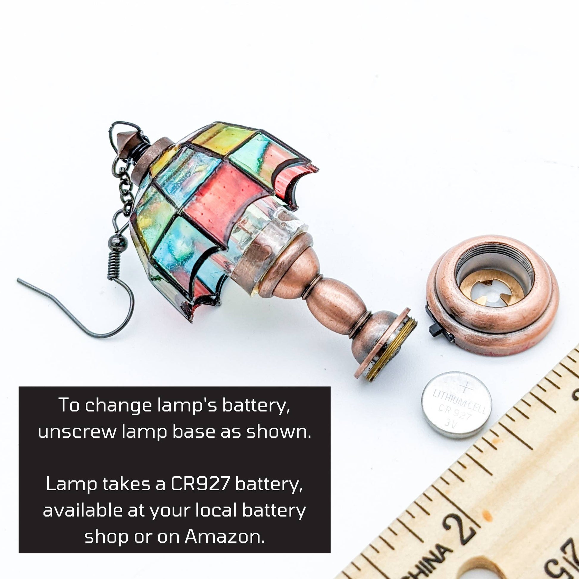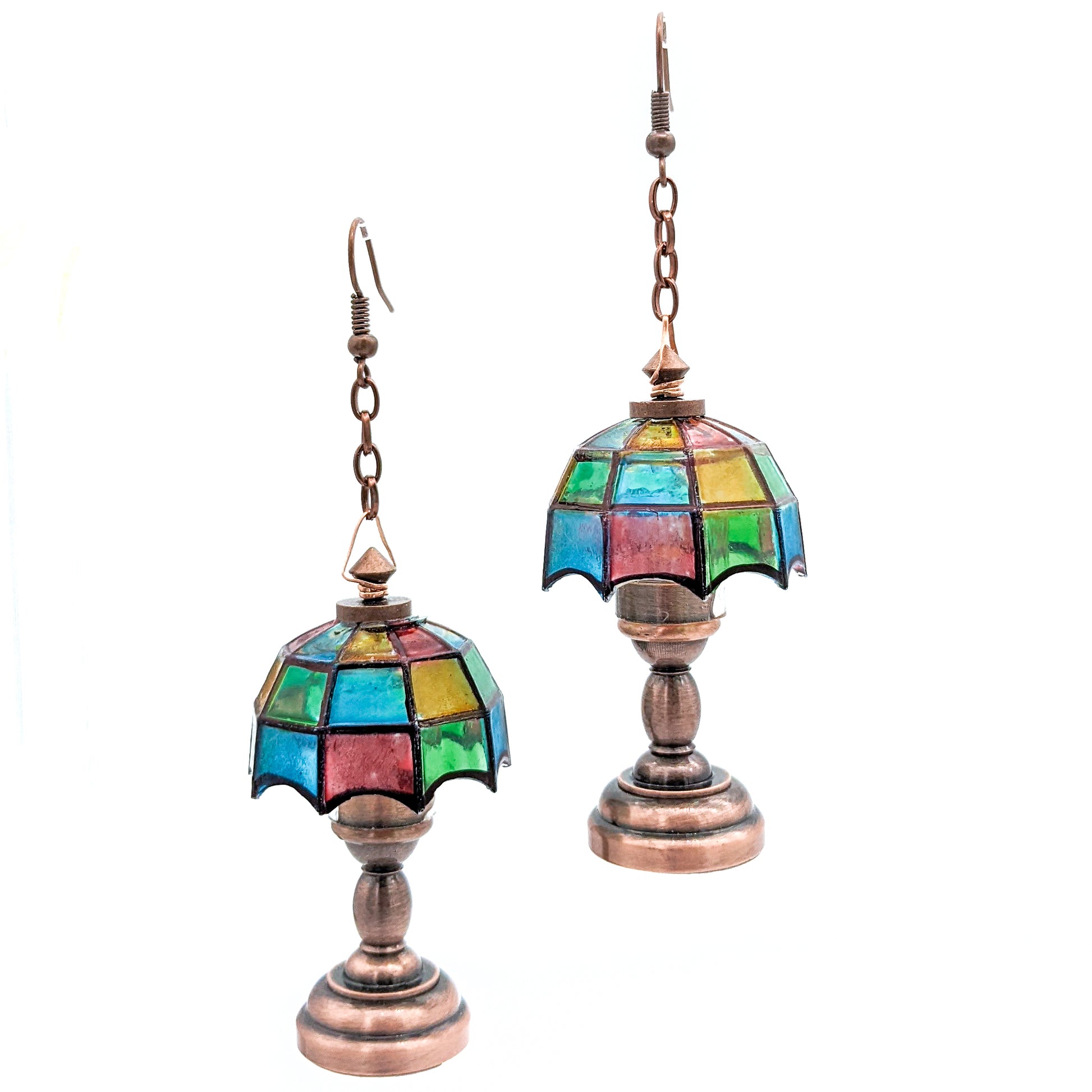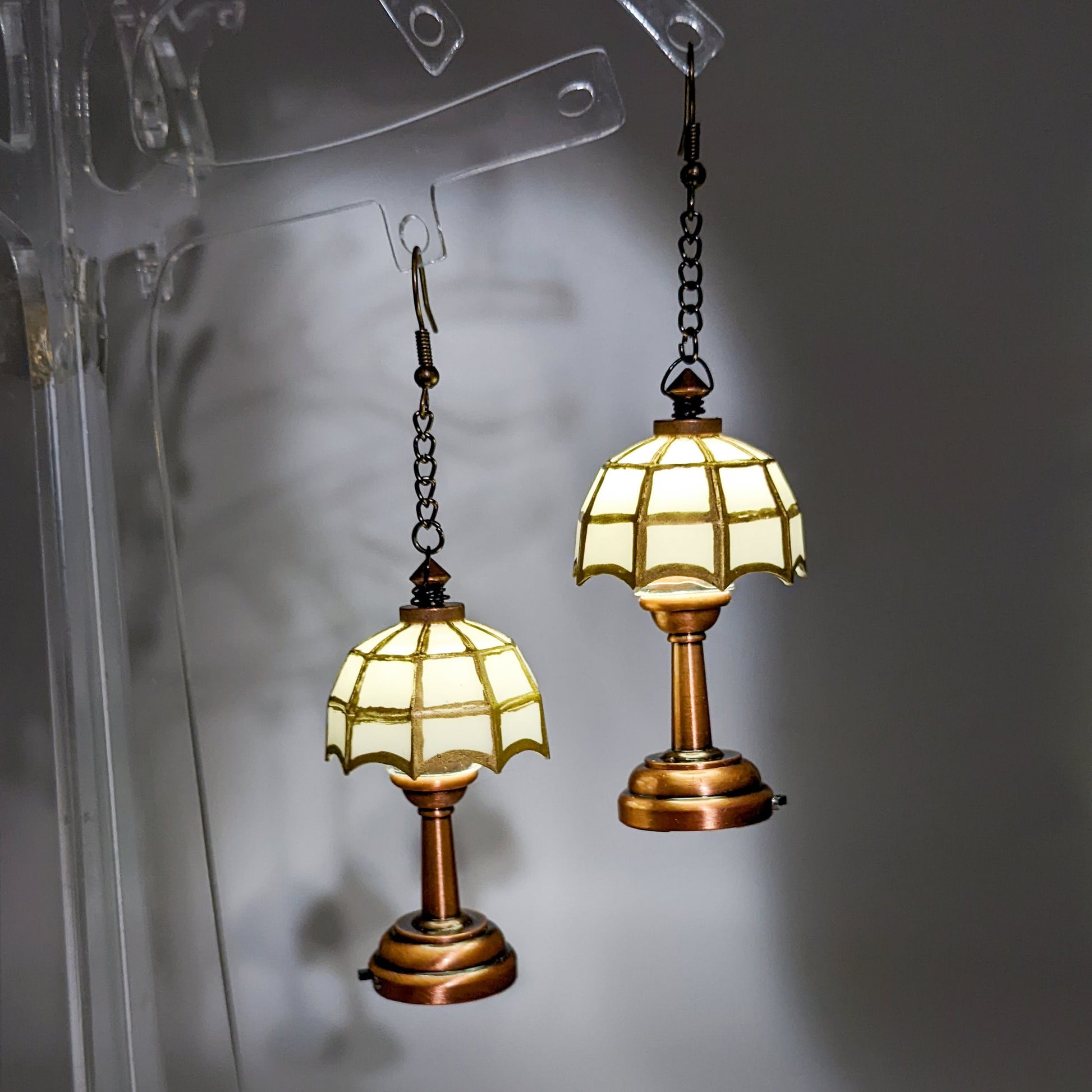 These 1:12 scale Tiffany-style table lamps make fabulous earrings that actually work! Each lamp is about two inches tall and has a copper base. The lampshade is multi-colored plastic that casts a wonderful glow across your neck and cheeks when you turn on the lamp. A small switch in the base switches the LED light on and off.