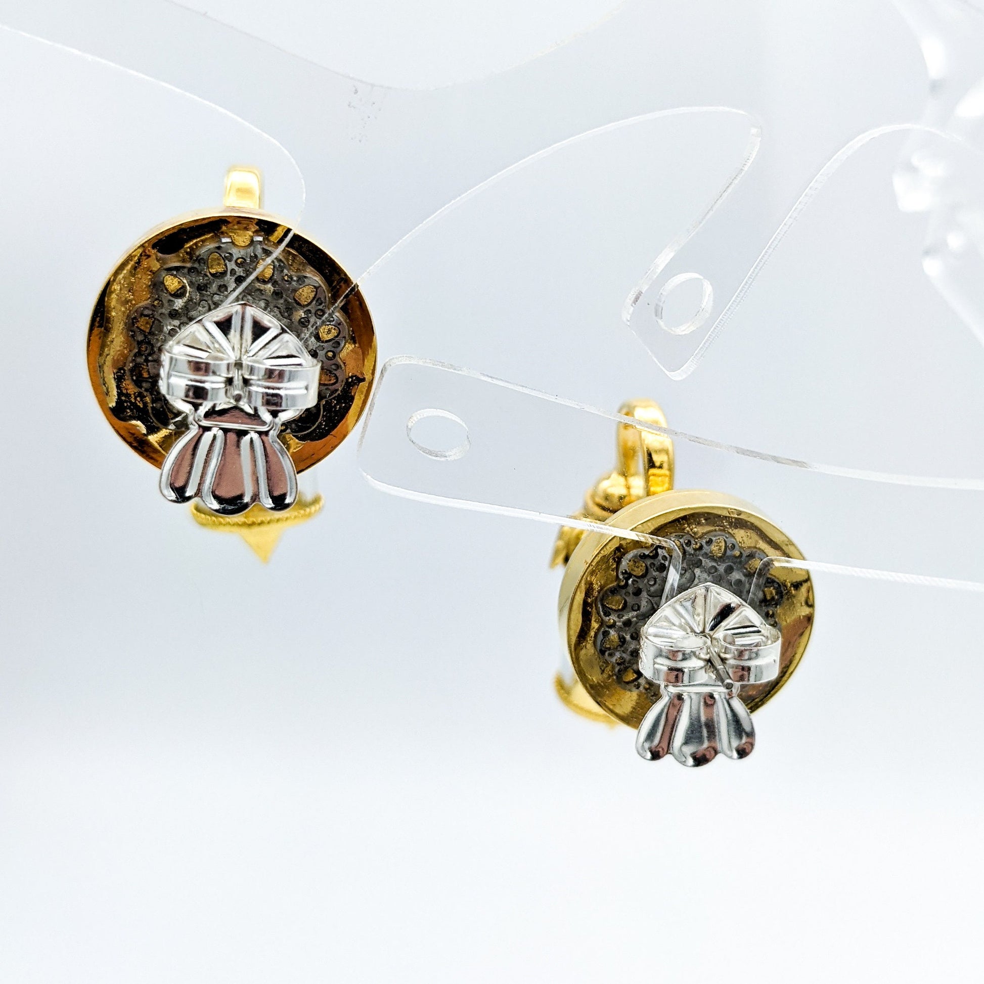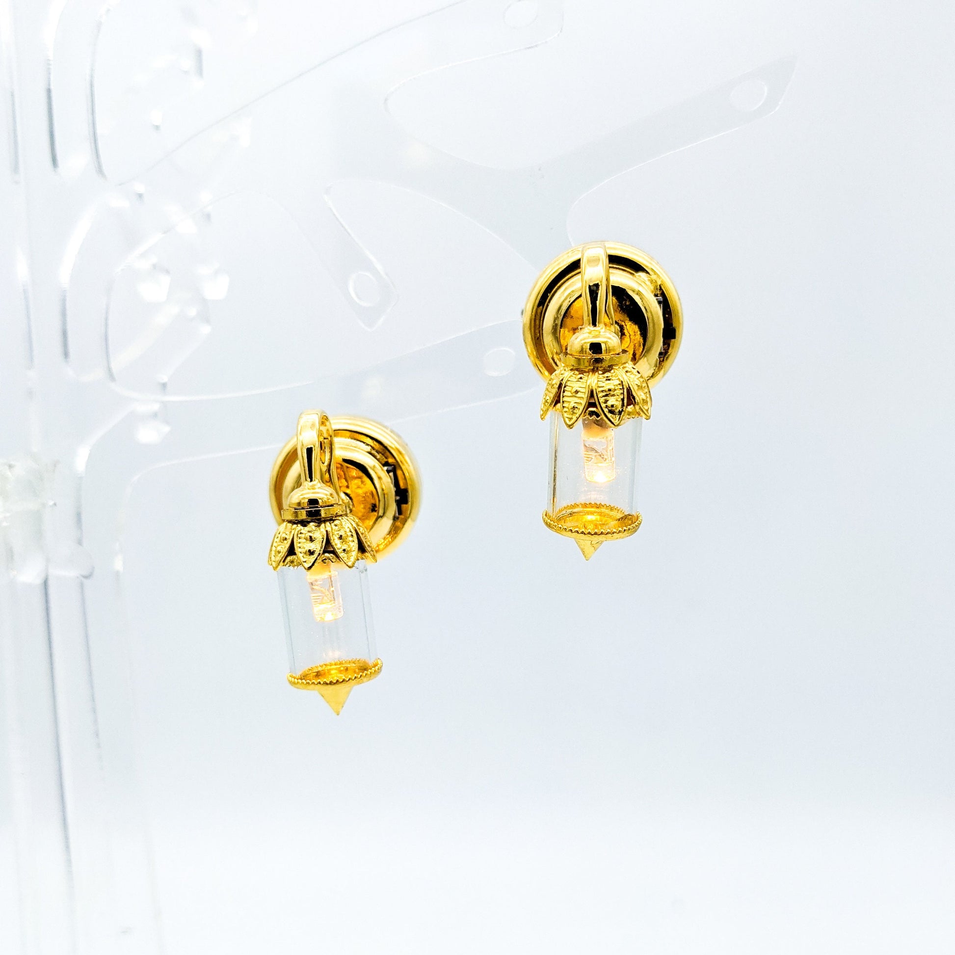 Unusual, interesting, functional, and fun! These tiny dollhouse-size 1:12 scale wall lamps really light up. There is a little switch that turns on the tiny LED, and the button battery is easily replaceable. The base is gold-colored metal, so they are a bit heavy for post earrings, about .4 ounce (11 grams). We have included extra-large earring backs for stability.