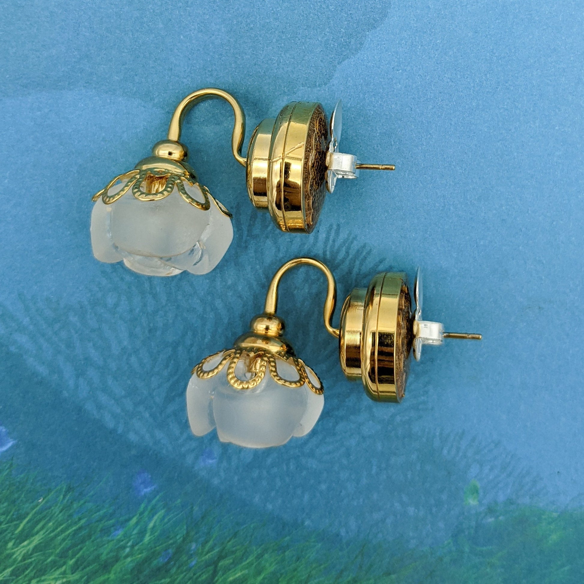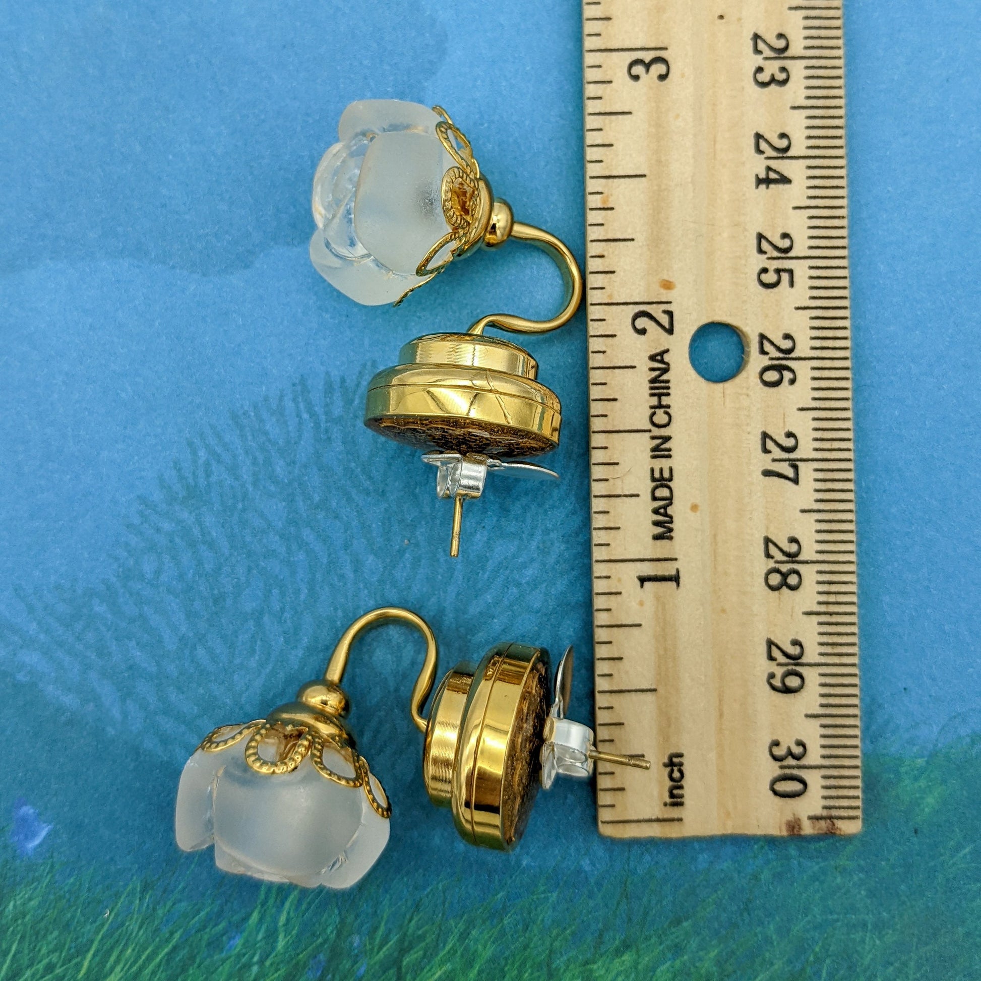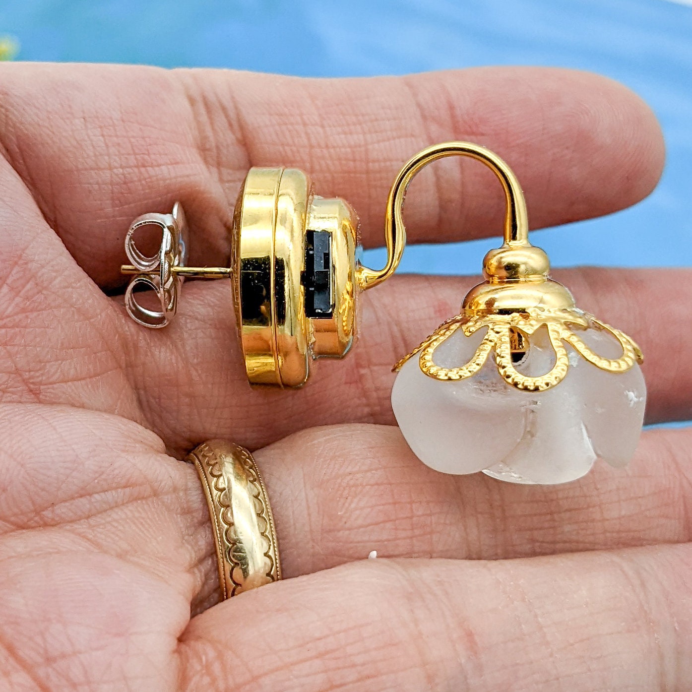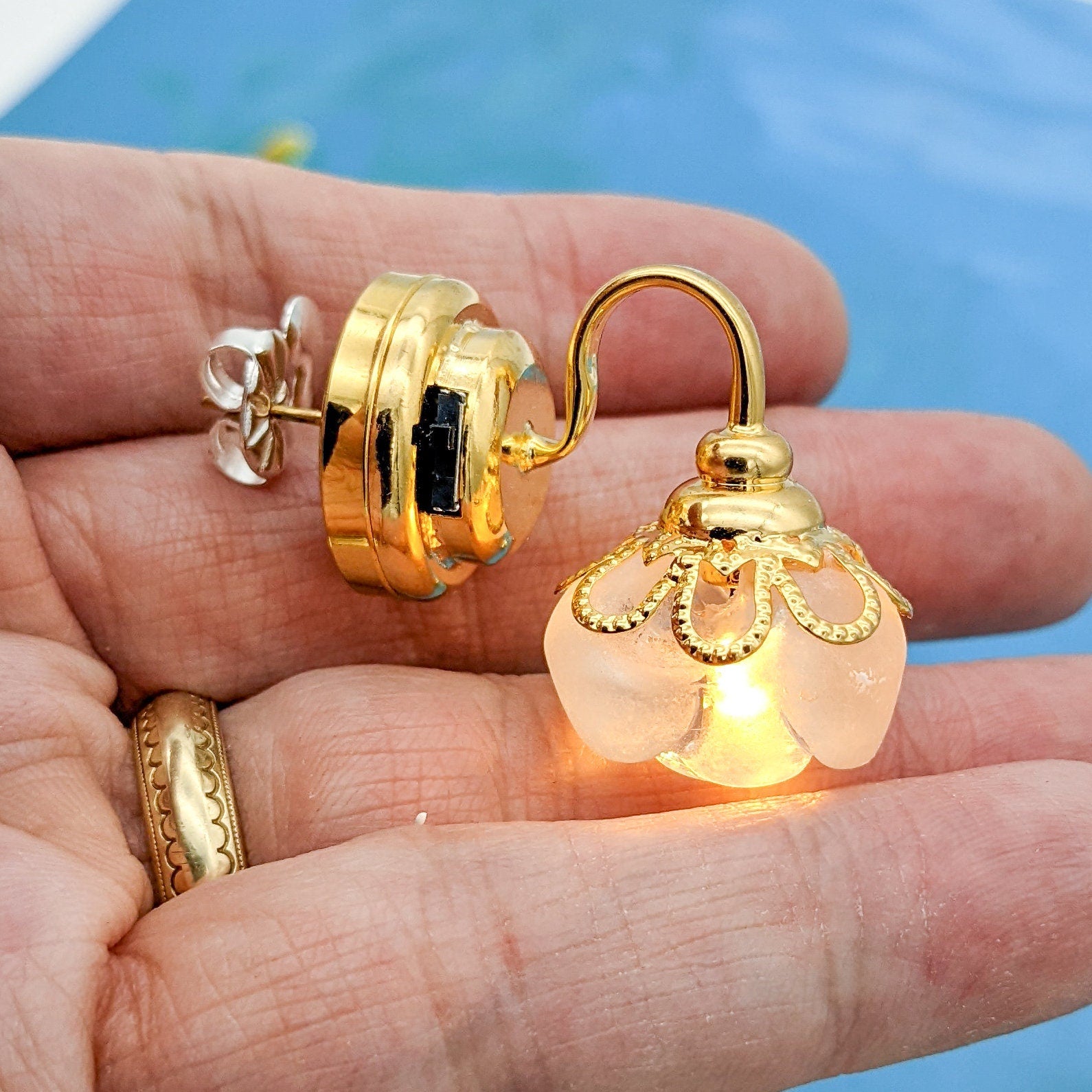 Unusual, interesting, functional, and fun! These tiny dollhouse-size 1:12 scale wall lamps really light up. There is a little switch that turns on the tiny LED, and the button battery is easily replaceable. The base is gold-colored metal, so they are a bit heavy for post earrings, about .4 ounce (14g). We have included extra-large earring backs for stability.