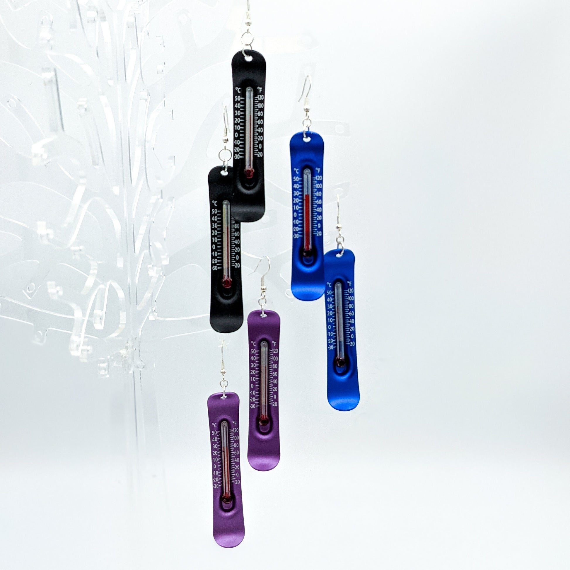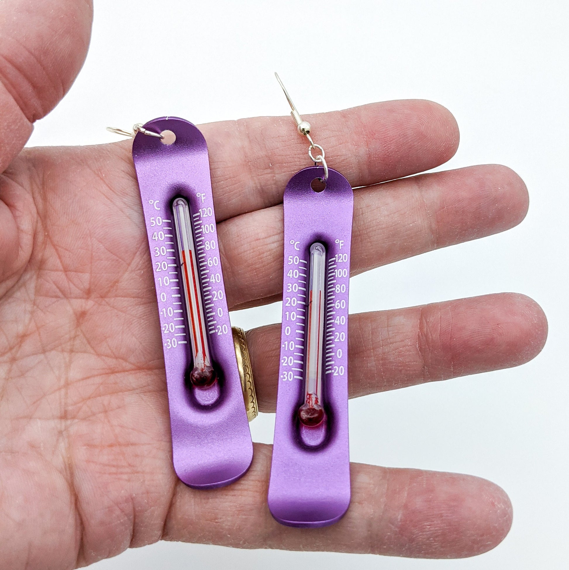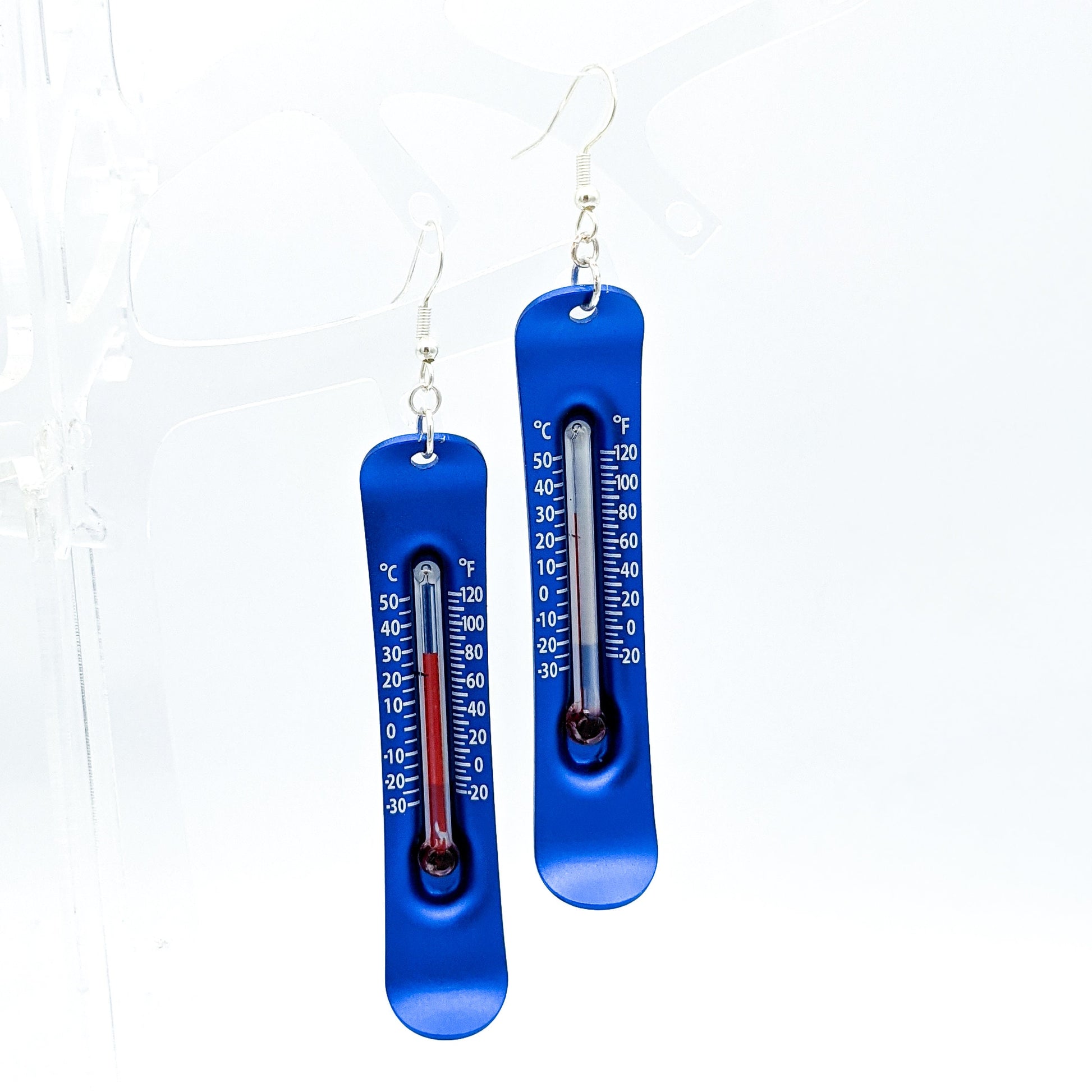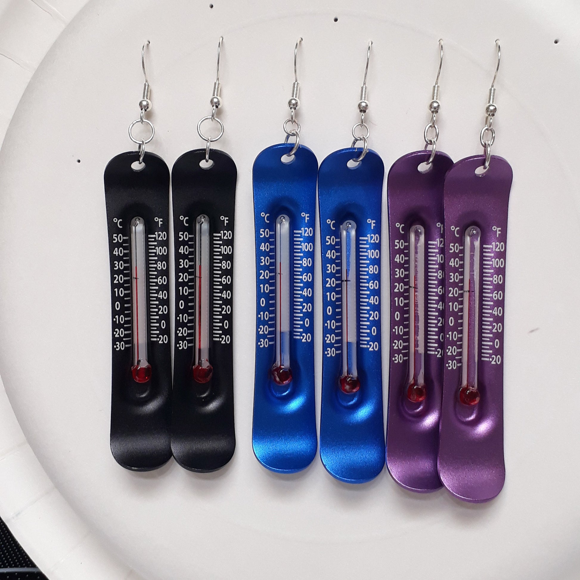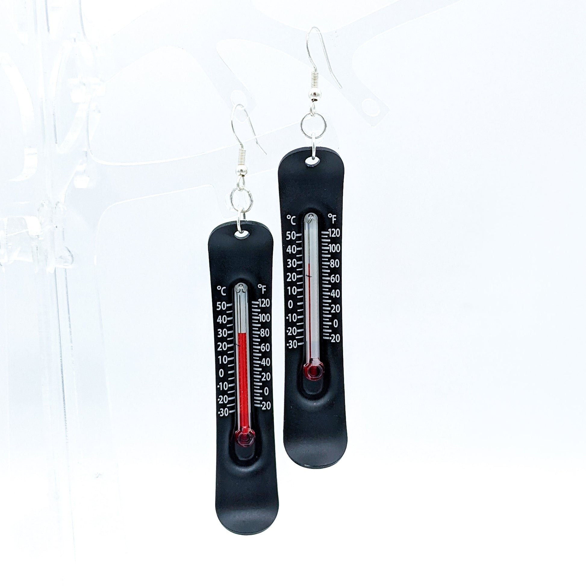 Thermometer housing measures about 3" high and 1/2" wide. Total earning length is about 3-3/4". They only weigh 4 grams each (less than a nickel), so they should be comfortable for almost anyone.