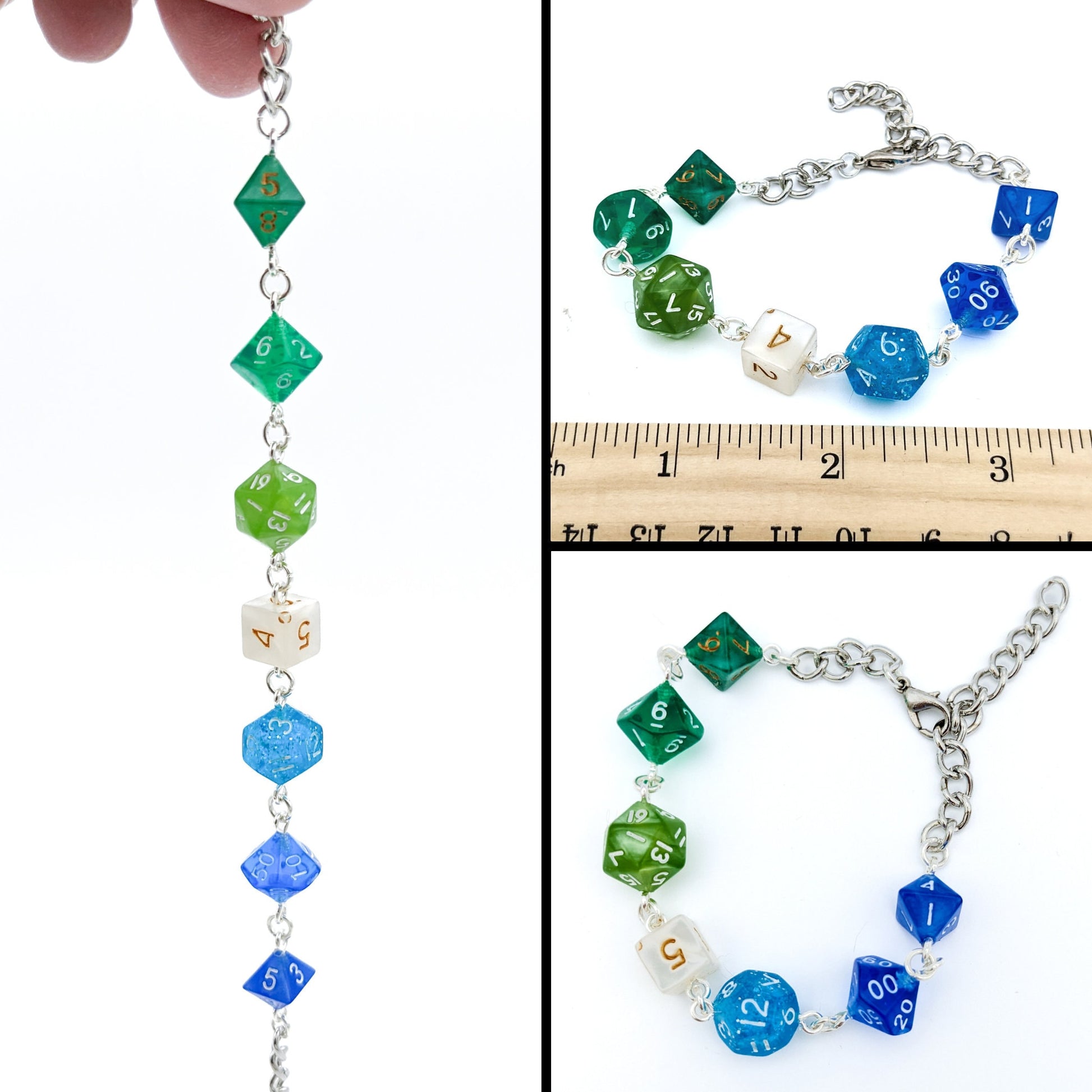 The bracelets have three colors of green, white, and three colors of blue, for a total of seven tiny dice per bracelet. Each bracelet is adjustable from about 6-1/2 inches to 8-1/2 inches and has a lobster-claw clasp.