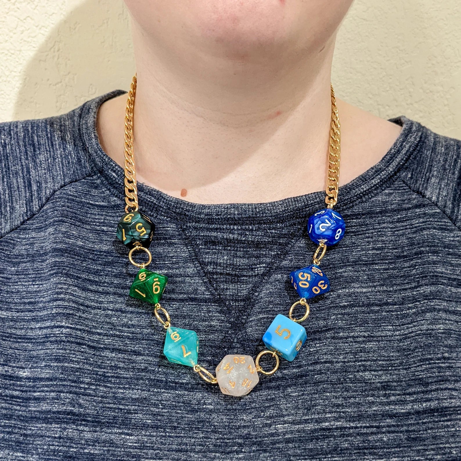 The necklace is seven different dice on a silver colored chain. Dice colors reflect the pride flag: dark green, green, light green, pearl white, light blue, blue, and dark blue.