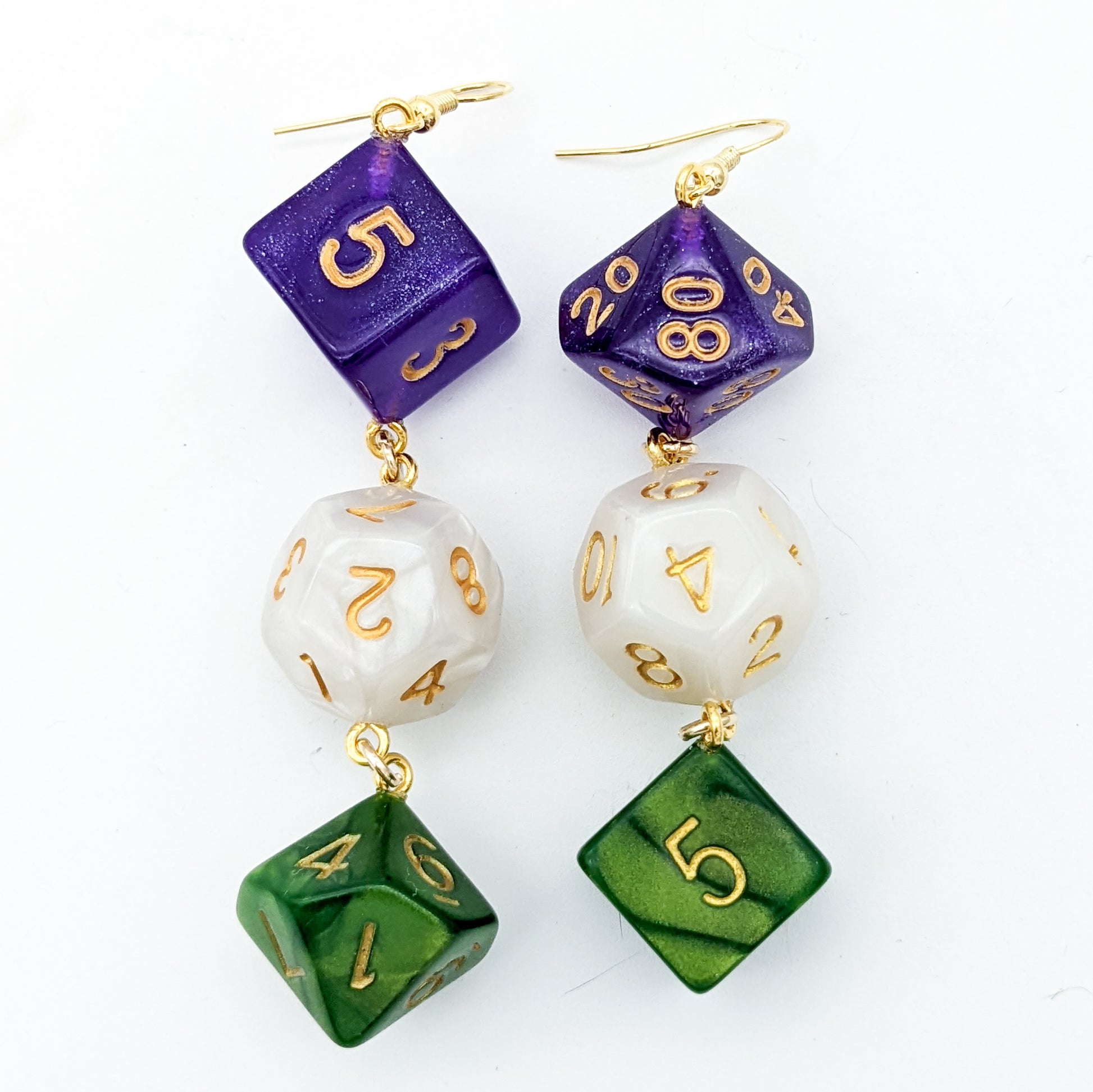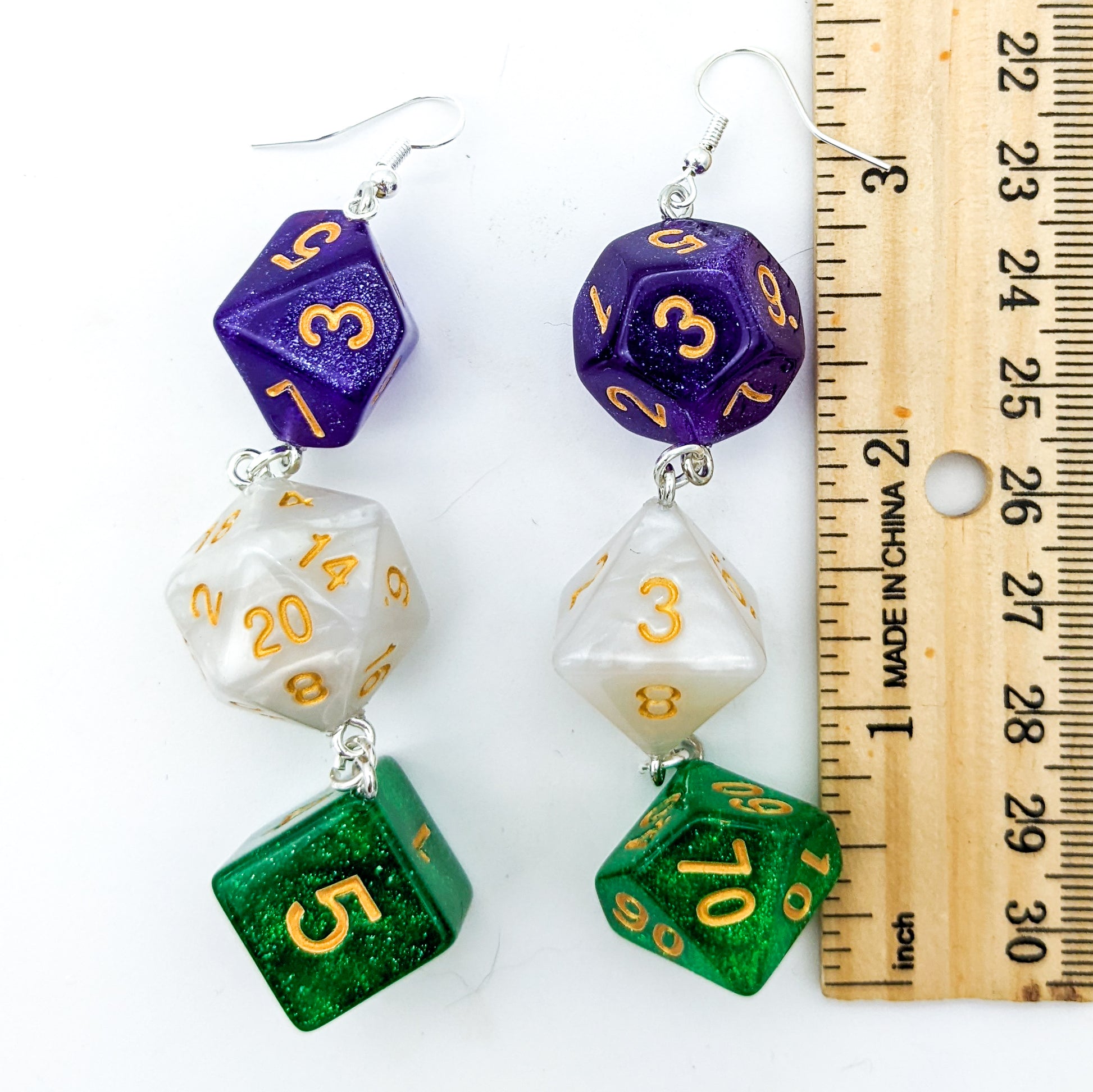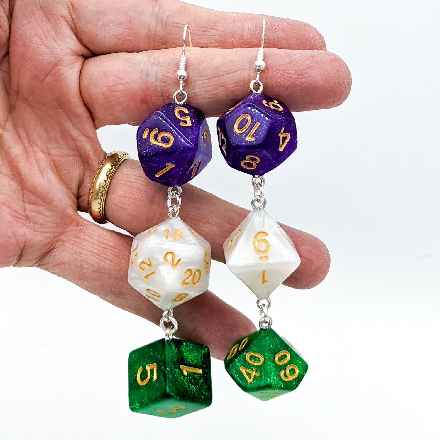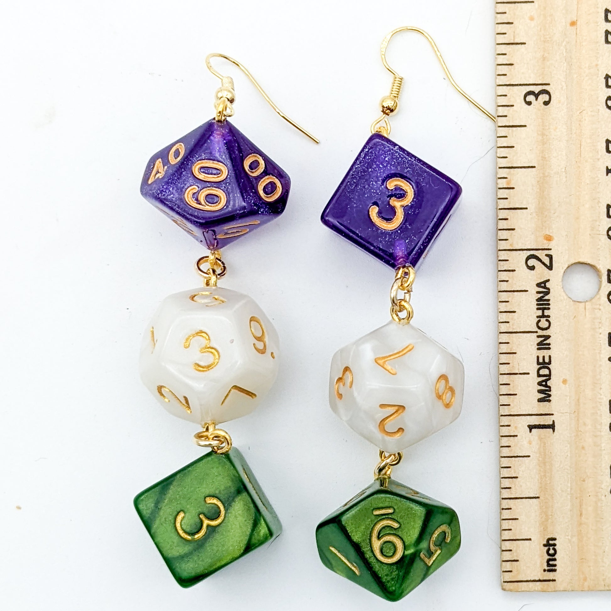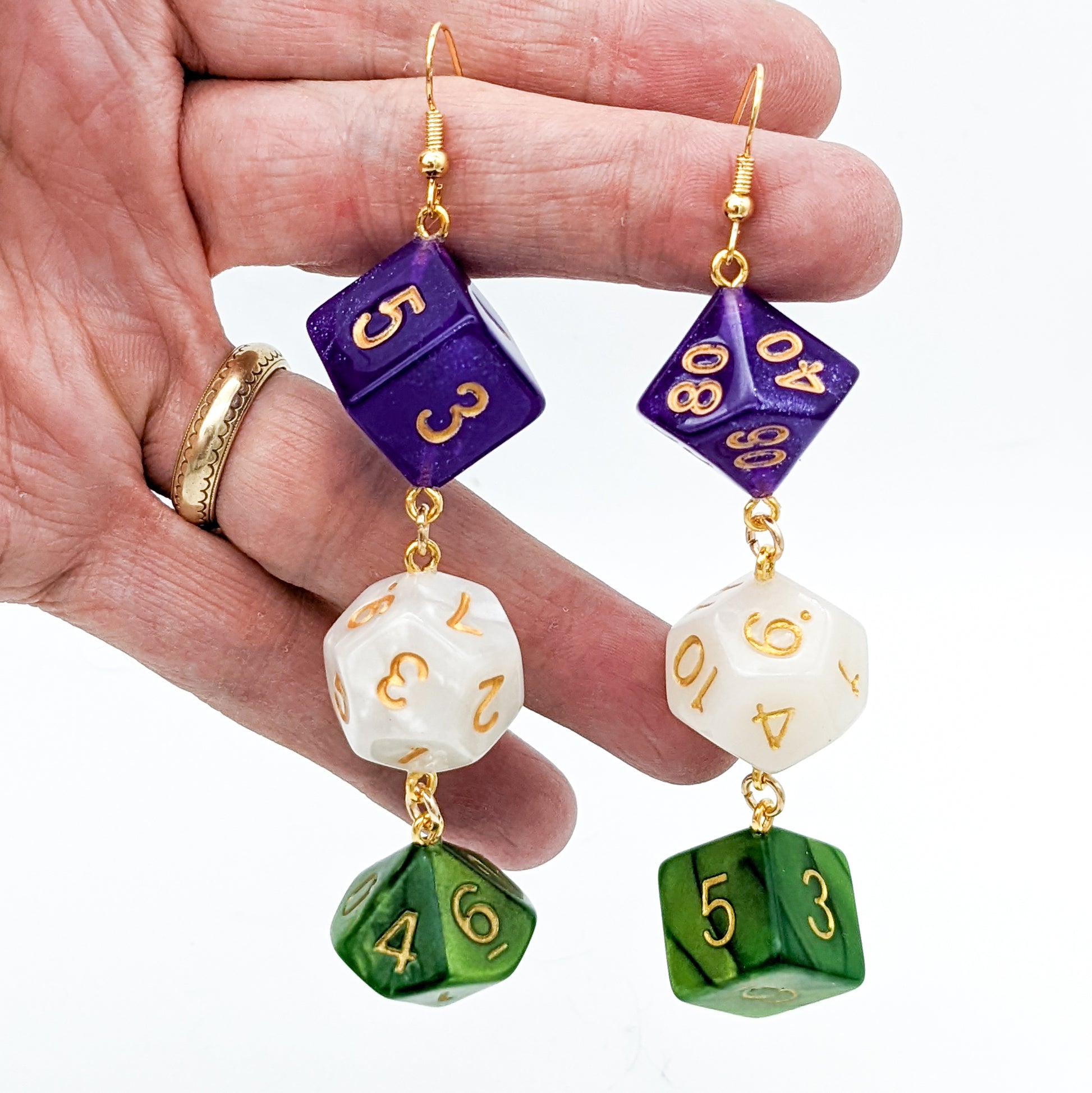 Each earring has 3 dice and is about 3-3/4 inches long. They are easy to wear, weighing less than a half-ounce apiece. The dice in each earring are purple, white, and green to reflect the genderqueer pride flag.
