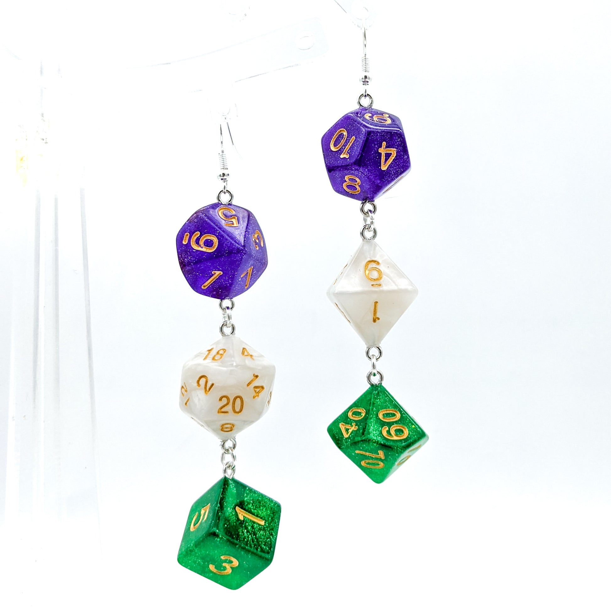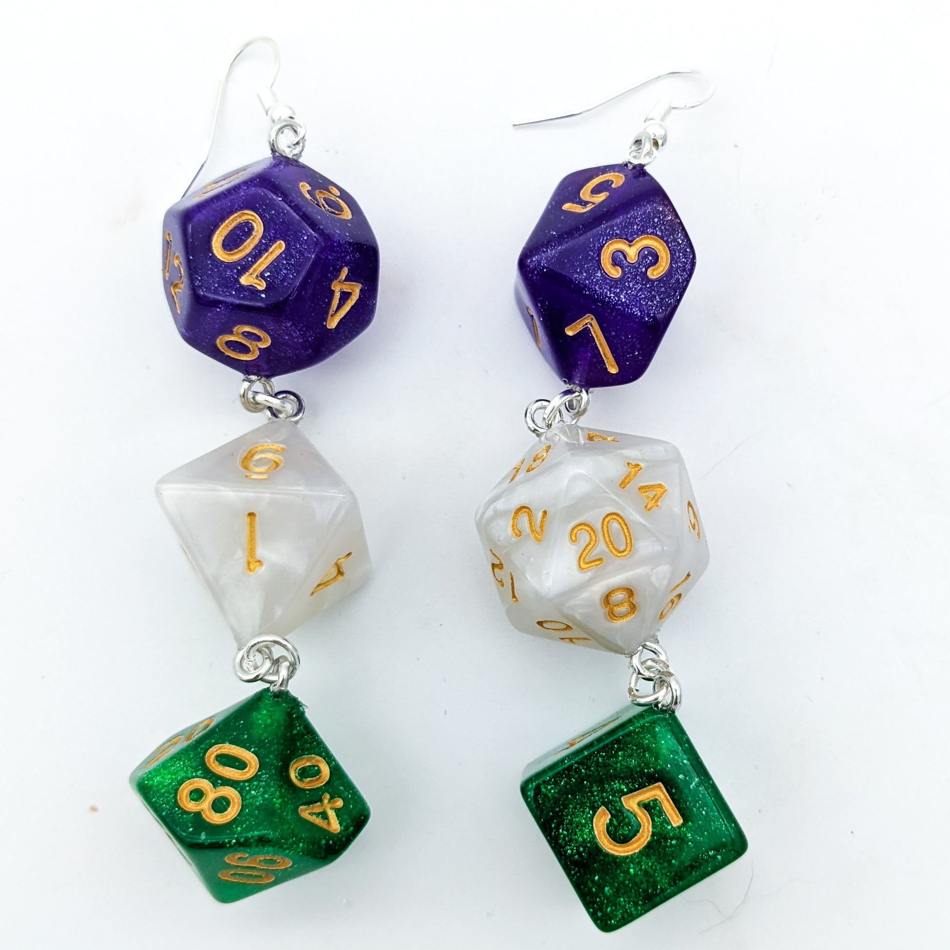 Genderqueer flag colors in some awesome dice earrings! Signal your pride and love of gaming with these geeky, quirky, fun polyhedral dice earrings. Great for lovers of D&D, Pathfinder, or other tabletop RPG games.