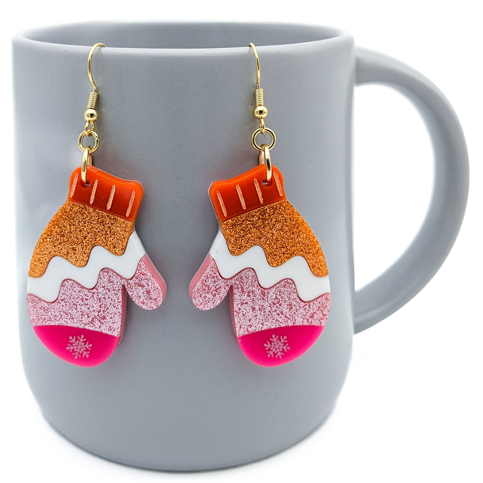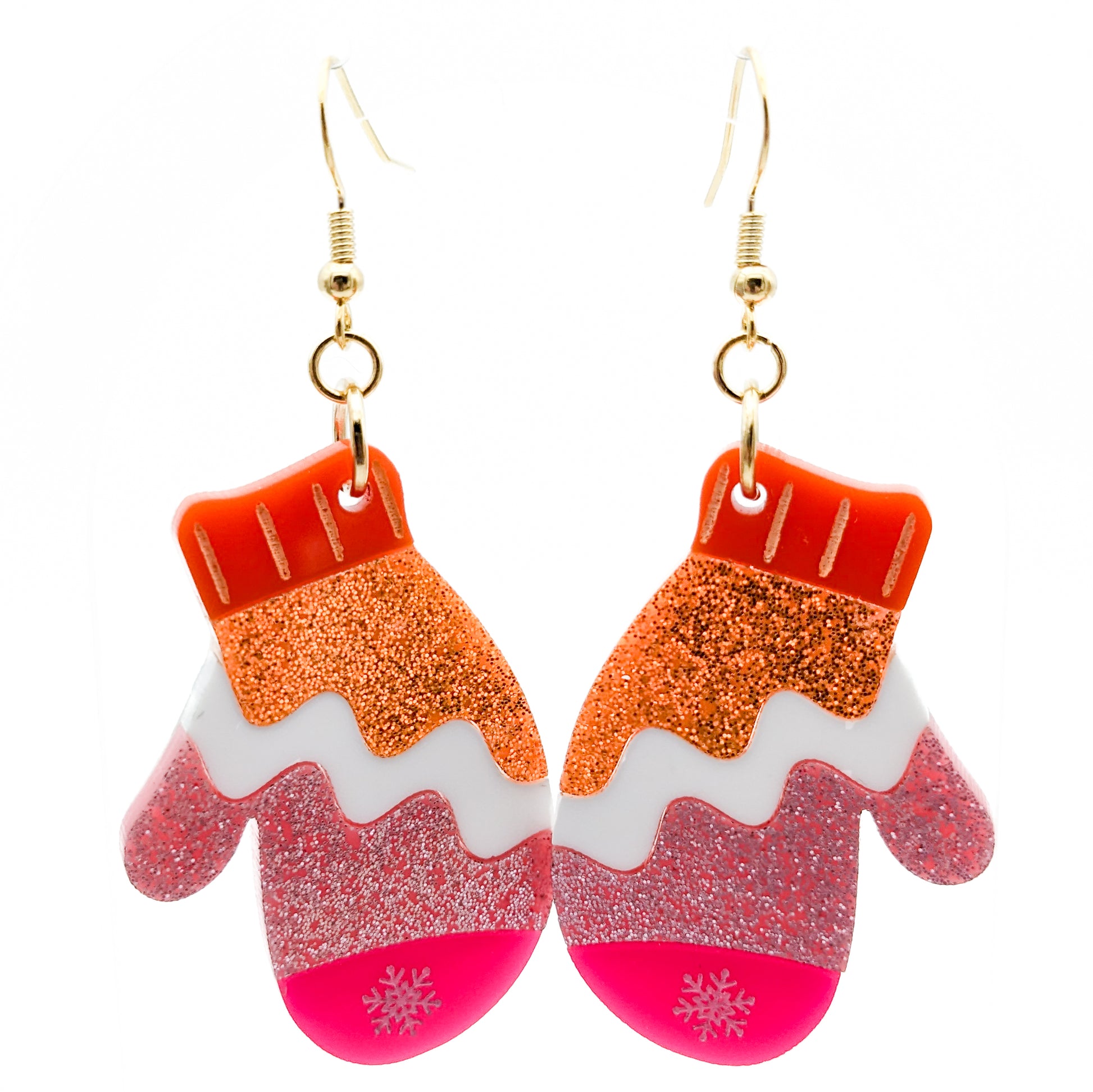 Wear cozy and a cute mitten earrings in shades of orange, white, and pink to mirror the lesbian pride flag colors. (I know the glitter orange looks dark in the photos, but it's lighter in person!) I've used five colors of laser-cut acrylic (solid dark orange, glitter light orange, opaque white, glitter light pink, and solid dark pink) to make these winter-themed earrings. They have a solid white back and hang from gold-plated hooks.