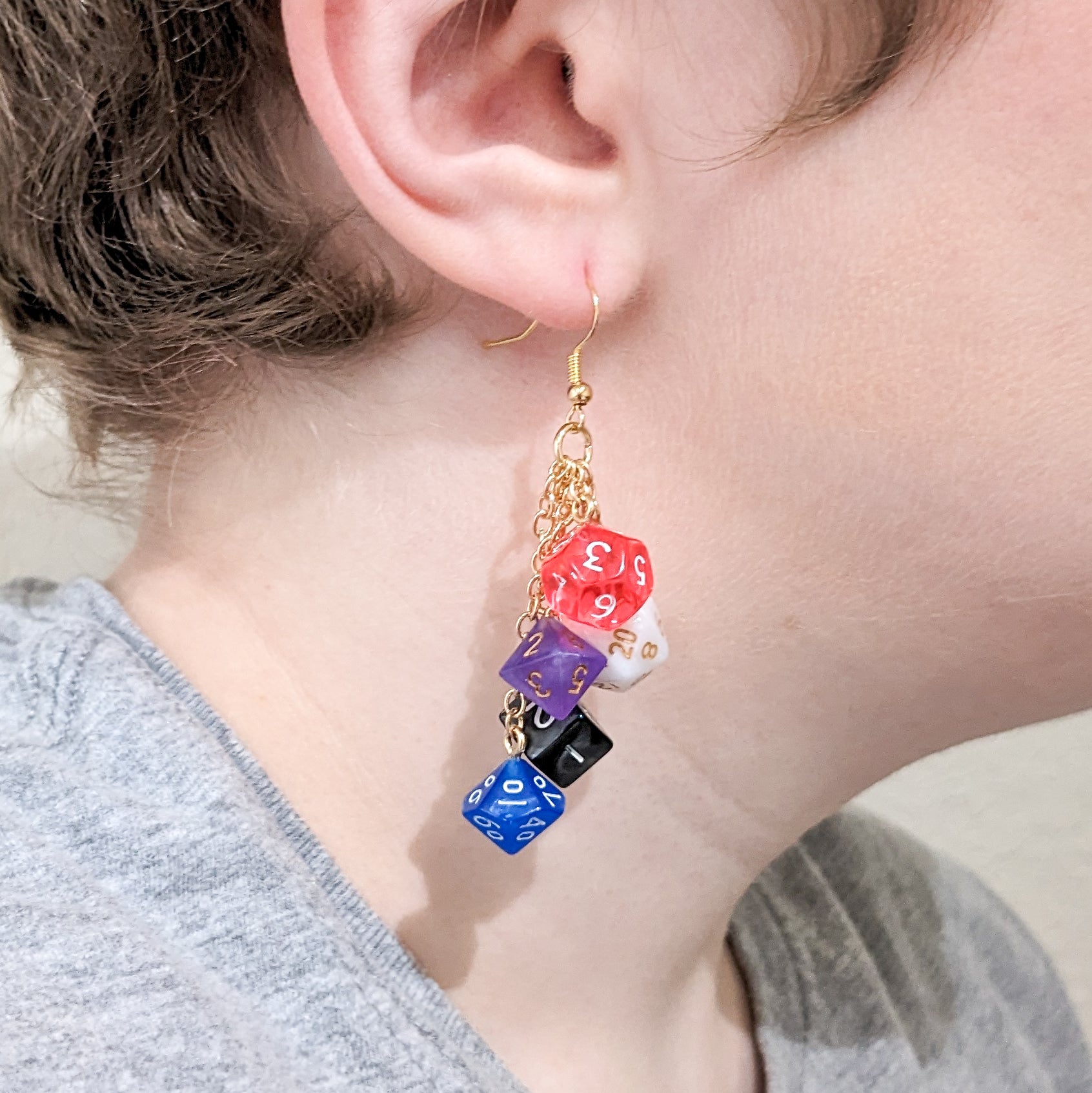I use actual dice, drilling holes and inserting screw eyes, linking the dice with jump rings, and attaching earring findings or neck chains to make these RPG-inspired creations. Metals are lead and nickel free.