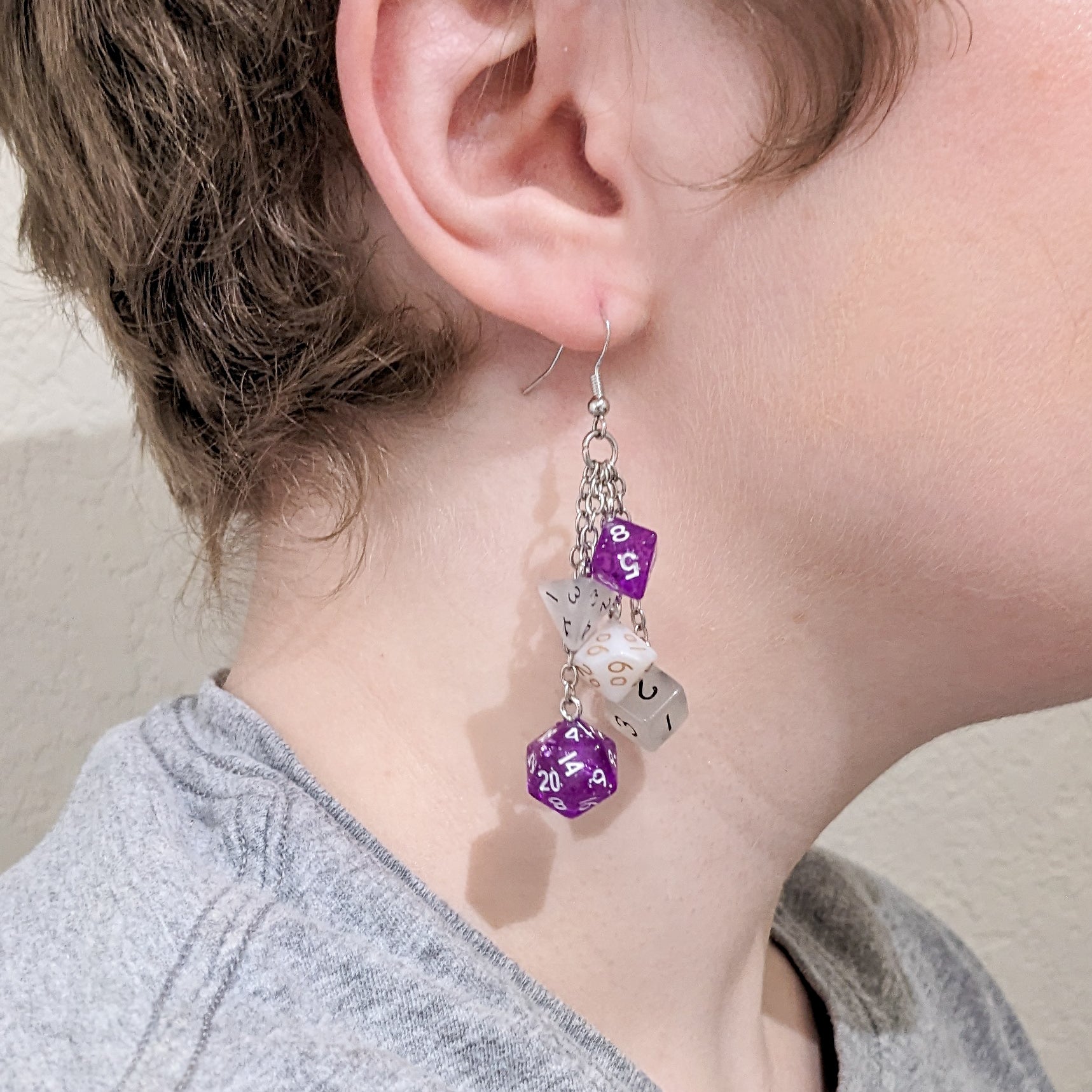 Graysexual pride flag colors in an awesome pair of miniature dice earrings! These sweet earrings are made of actual half-size (about 10mm) polyhedral dice in the colors of the graysexual pride flag (purple, light gray, white, light gray, purple), making them perfect for gray/demi lovers of DND, Pathfinder, or other RPGs. The light-gray dice are glow-in-the-dark, and give off a faint green light in the dark after exposure to light.