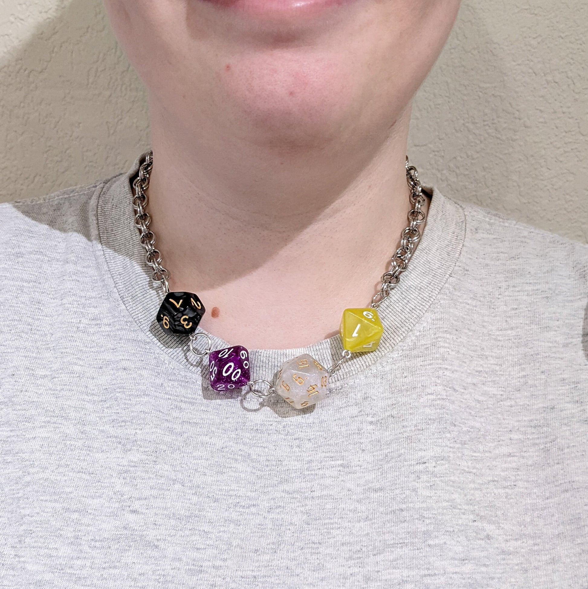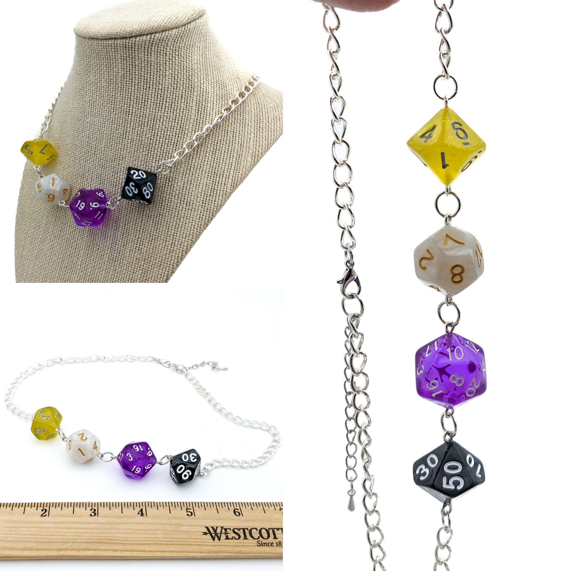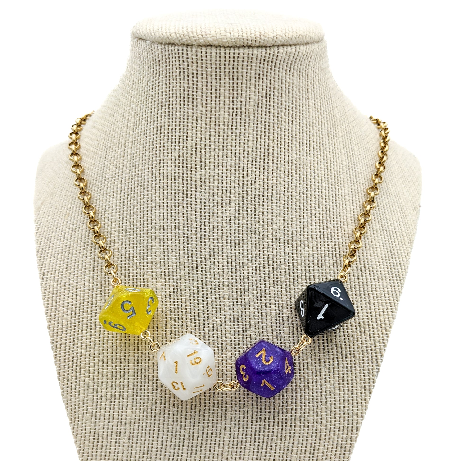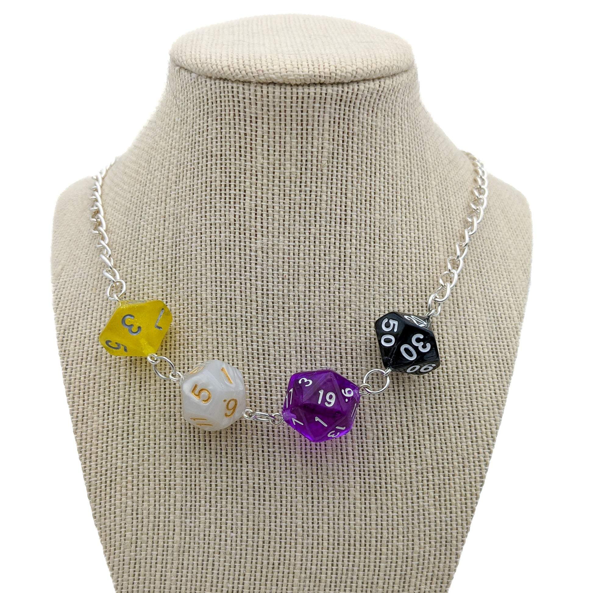 This RPG-inspired necklace features polyhedral dice that mirror the colors of the non-binary pride flag: yellow, white, purple, and black. Signal your pride and love of gaming with this geeky, quirky, fun necklace. Great for lovers of D&D, Pathfinder, or other tabletop RPG games.