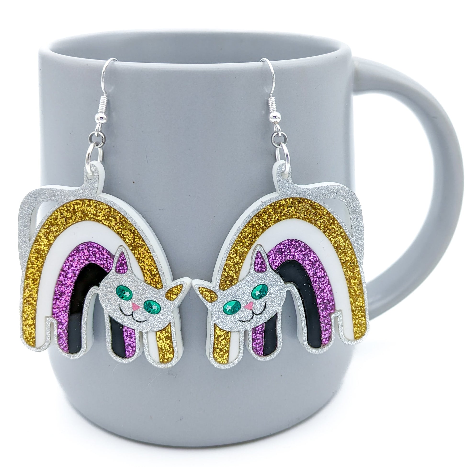 Nonbinary Pride Cat Earrings - Pride Flag Cat Earrings -Big Bold Rainbow Cat - LGBTQ Jewelry - Laser Cut Acrylic