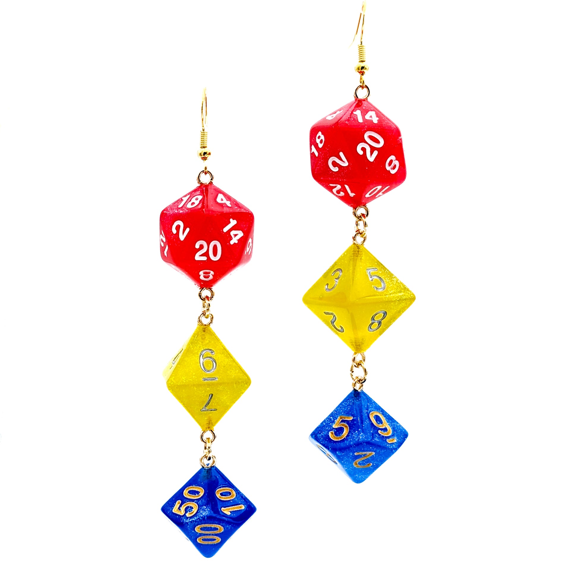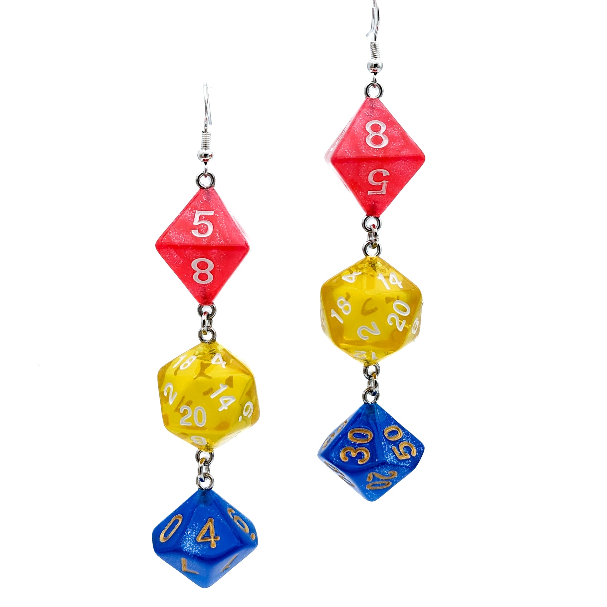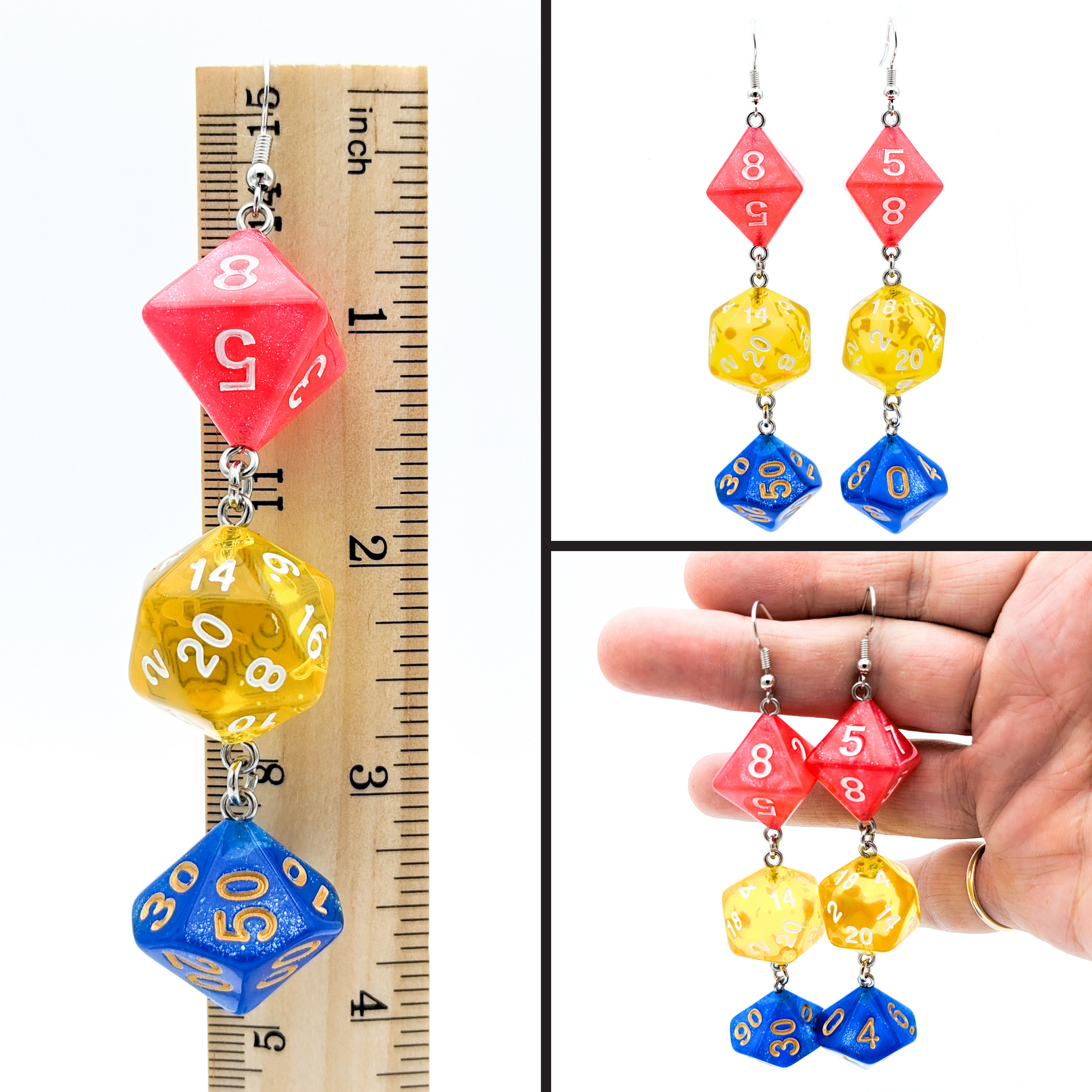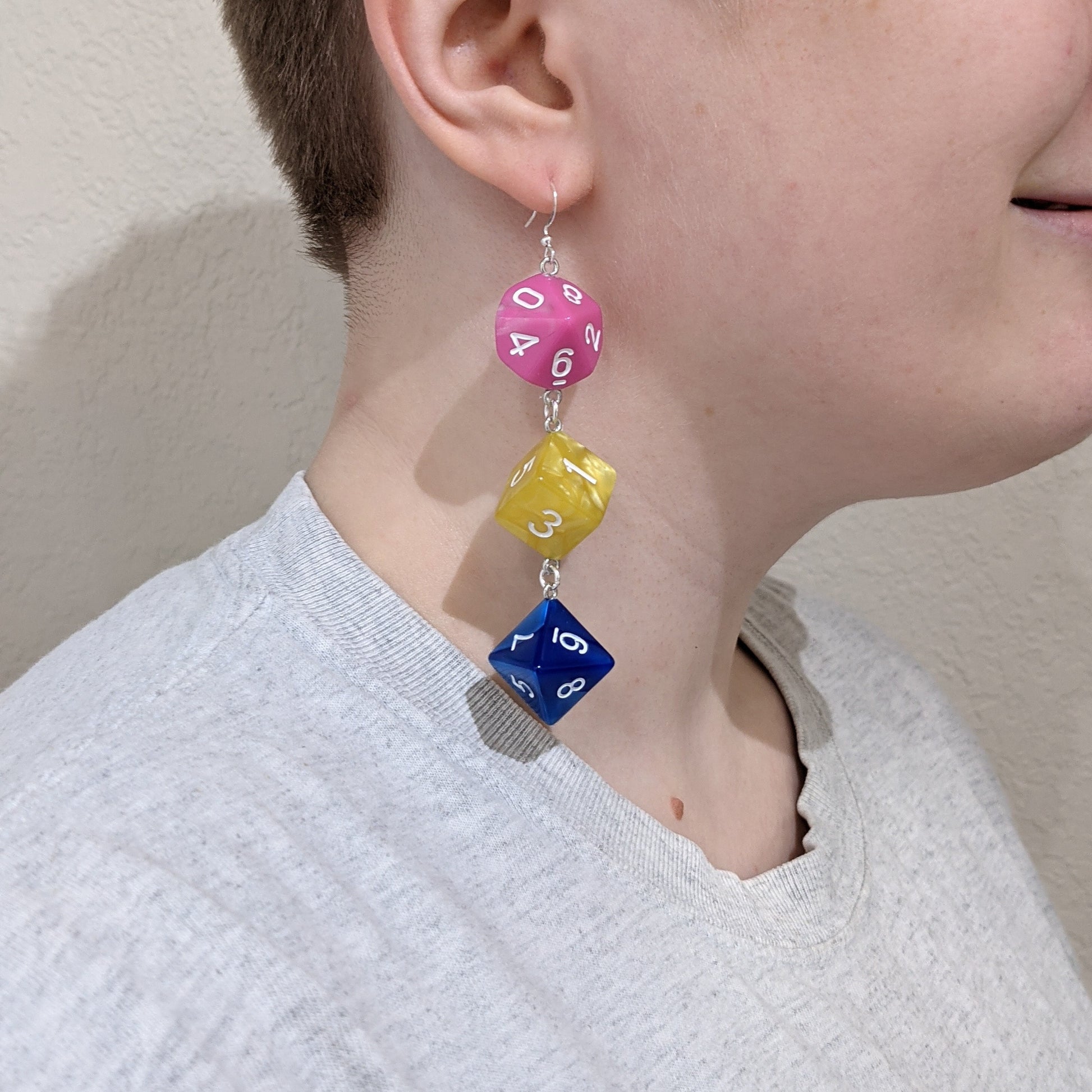 Each earring has 3 dice and is about 3-3/4 inches long. They weigh less than a half-ounce apiece, so they're not light, but wearable if you like big dangles. Colors are pink/yellow/blue to reflect the pansexual flag colors. Dice may vary, depending on what I have on hand when I make the earrings.