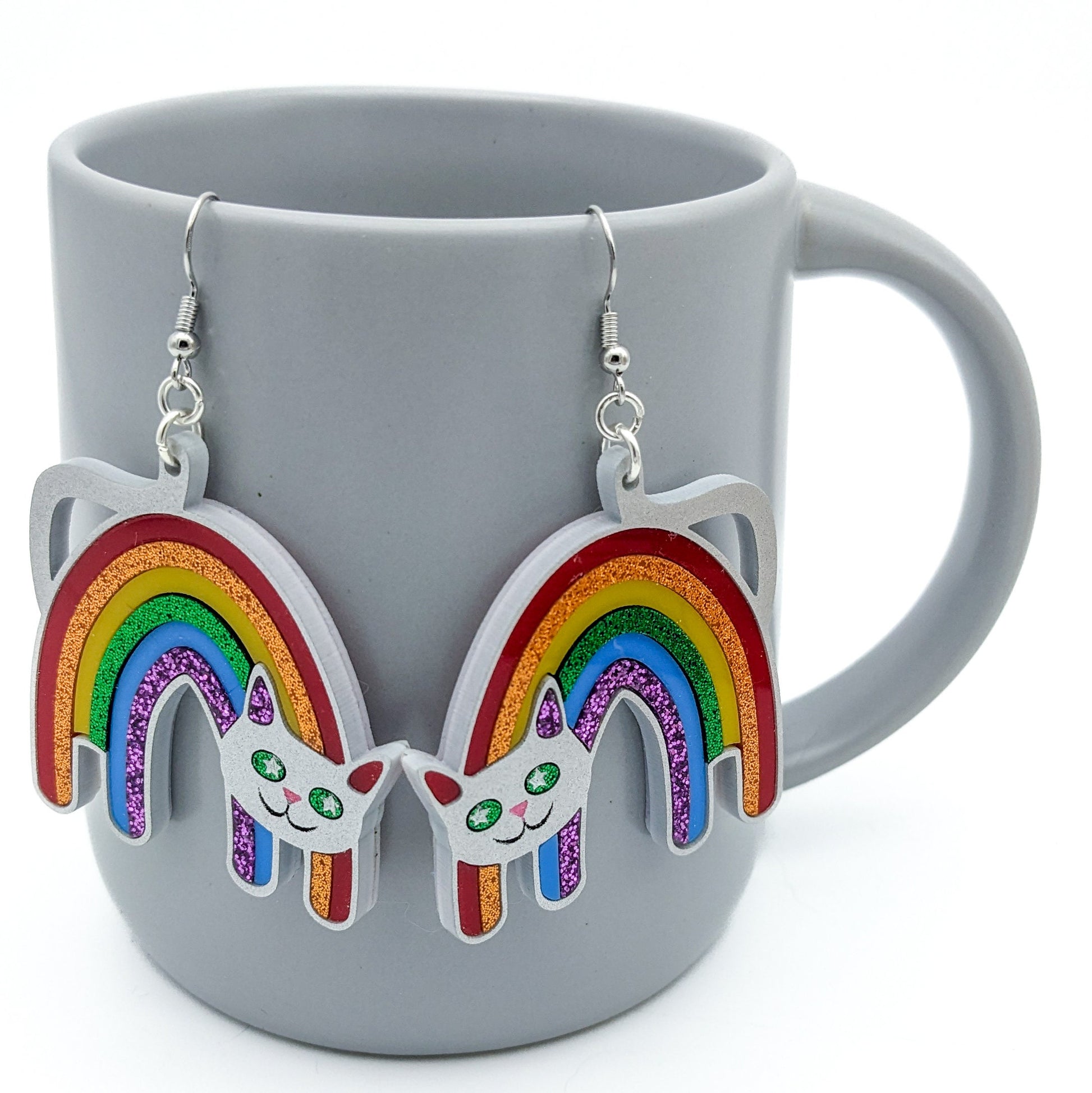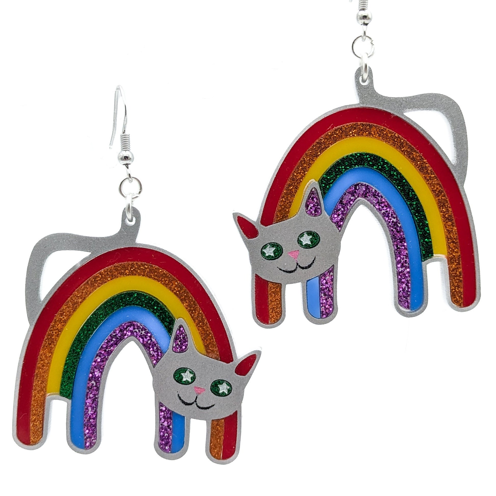 Rainbow Pride Cat Earrings - Pride Flag Cat Earrings -Big Bold Rainbow Cat - LGBTQ Jewelry - Laser Cut Acrylic